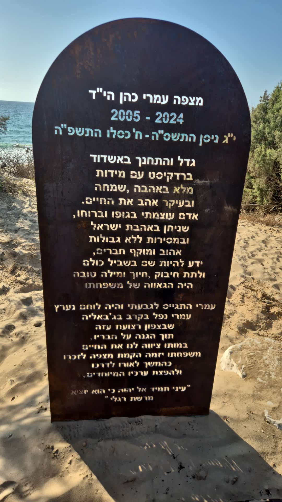 הבחירה במקום הזה לא הייתה מקרית. "אחרי שקיבלנו את ברכת הדרך מראש העיר", מספרת איריס, אמו של עמרי, "הסתובבתי לאורך החוף. היה יום סגרירי, מדי פעם ירדו כמה טיפות – אולי גשם, אולי דמעות. ואז, ברגע אחד, הרגשתי את עמרי אומר לי: 'כאן, אמא. זה המקום'".