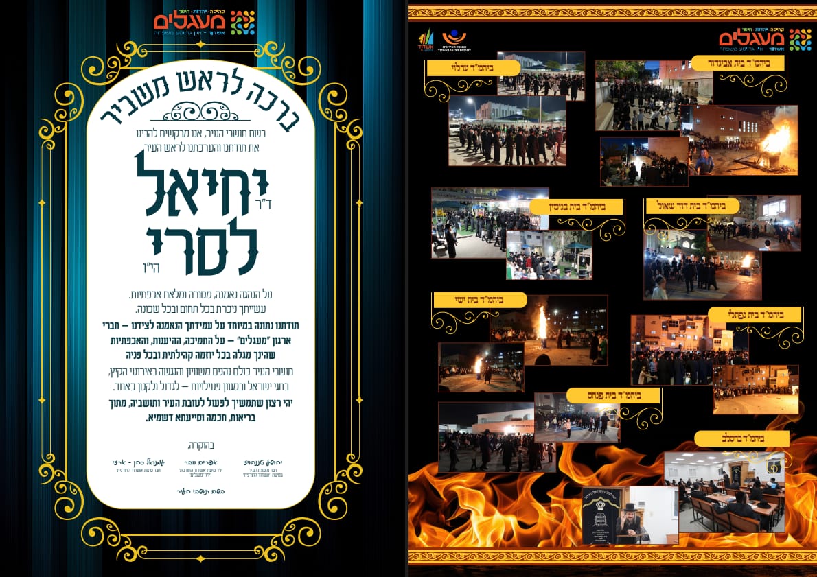 $(function(){ScheduleRotate([[function() {setImageBanner('37329ea7-7d1c-453d-924f-a5298d8c0327','/dyncontent/2025/12/10/b56ee83e-306e-49d6-a0b5-17e54d1247ed.jpg',18989,'נוסעים בביטחה. אפיקים',510,80,true,50858,'Image','');},15],[function() {setImageBanner('37329ea7-7d1c-453d-924f-a5298d8c0327','/dyncontent/2025/12/14/495c8feb-fa31-4a7b-aeda-7f8c71605a23.jpg',20552,'עושים חשבון. פועלים',510,80,true,50858,'Image','');},15],[function() {setImageBanner('37329ea7-7d1c-453d-924f-a5298d8c0327','/dyncontent/2025/12/10/958d8cbf-4b13-4015-b34d-b241d2b15b7b.jpg',19091,'סטארטאפיסטים? זו ההזדמנות שלכם!',510,80,true,50858,'Image','');},15]]);})תחת הכותרת "ברכה לראש משביר", מוסרים בסיעה כי "בשם תושבי העיר אנו מבקשים להביע את תודתינו והערכתינו לראש העיר ד"ר יחיאל לסרי על הנהגה נאמנה, מסןרה ומליאת אכפתיות. בפניה אישית לראש העיר הם אומרים כי "תודתינו נתונה לך במיוחד על עמידתך הנאמנה לצידנו - חברי ארגון מעגלים - התמיכה, היענות והאכפתיות שהנך מגלה בכל יוזמה קהילתית ובכל פניה". עוד הוסיפו: "תושבי העיר כולם נהנים משוויון והנגשה באירועי הקיץ, בחגי ישראל ובמגוון פעילויות לגדול ולקטן כאחד".. את דבריהם חתמו בברכה: "יהי רצון שתמשיך לפעול למען העיר ותושביה מתוך בריאות, חתכמה וסייעתא דשמיא".
