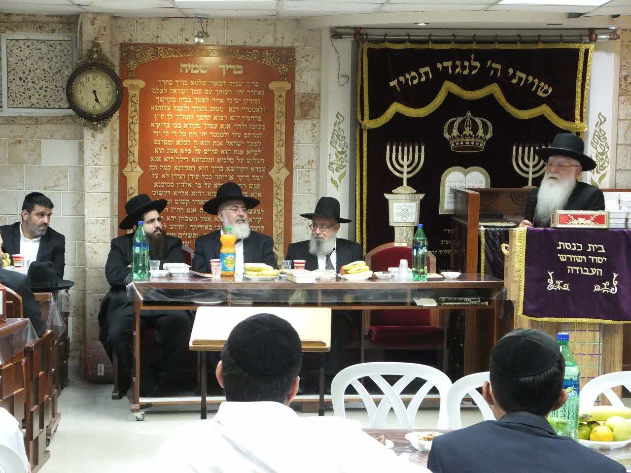 בשבת בבוקר לאחר תפילת מוסף, התקיים "קידושא רבה" לרגל ההודעה המשמחת על בניית בית הכנסת בקרוב ועל הקמת בית הכנסת הזמני שהוקם תוך זמן קצר. קודם לכן מסר שיעור בהלכה רב בית הכנסת הרה"ג רבי יהודה חיבטוב שליט"א מחבר הספר "שבת כהלכתה" לוח מוקצה ועוד, ומוסר שיעורי הלכה בבית הכנסת שנים רבות.