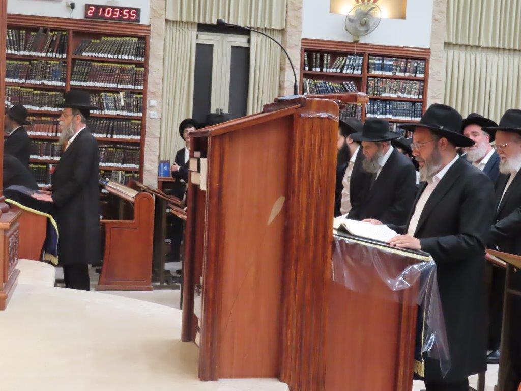לפני התיבה בתפילת מעריב עבר יד ימינו ונאמן ביתו הרה"ג ר' משה ליפשיץ שליט"א, לאחר עלינו לשבח, קראו פרק תהילים ולאחריה אמרו ברכת 'מי שבירך' כשכל העיניים נשואות למזרח לצד ארון הקודש למוצא פיו של הגאב"ד שליט"א.