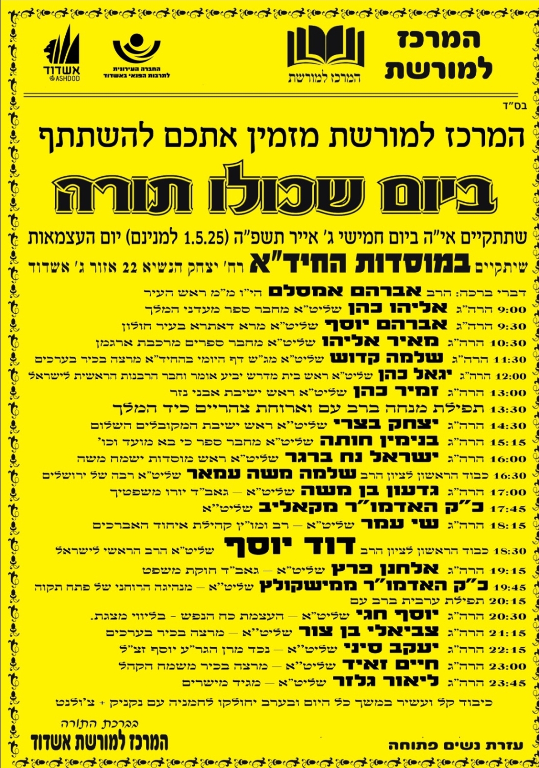 כמדי שנה ביום העצמאות, גם השנה מקיים 'המרכז למורשת' בראשות מ"מ ראש העיר הרב אבי אמסלם יום שכולו תורה שבמהלכו יימסרו דרשות והרצאות מפי גדולי הרבנים ובכירי המרצים לאורך כל היום. היום המיוחד שיהיה מלא וגדוש בתורה יתקיים אי"ה בבית המדרש שע"י 'מוסדות החיד"א' סביב השעון, החל מ-9:00 בבוקר ועד 12:00 בלילה. את היום יפתח בדברי ברכה מ"מ ראש העיר ר' אבי אמסלם, ולאחר מכן יעלו ויבואו וישאו מדברותיהם: הרה"ג אברהם יוסף רבה של העיר חולון, הרה"ג מאיר אליהו מגיד מישרים ומח"ס מרכבות ארגמן, הרה"ג יגאל כהן ראש מוסדות 'יביע אומר' וחבר מועצת הרבנות הראשית, הרה"ג זמיר כהן ראש ישיבת 'אבני נזר' ונשיא ארגון 'הידברות', הרה"ג יצחק בצרי ראש ישיבת המקובלים 'השלום', הרה"ג שלמה משה עמאר הרב הראשל"צ והרב הראשי לישראל ולירושלים לשעבר, כ"ק האדמו"ר מקאליב, הרה"ג דוד יוסף הראשון לציון והרב הראשי לישראל, הרה"ג אלחנן פרץ גאב"ד 'חוקת משפט', ומזכי הרבים מגידי המישרים הרב צביאלי בן צור, הרב חיים זאיד והרב ליאור גלזר.