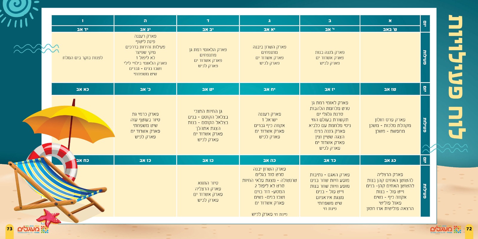 $(function(){ScheduleRotate([[function() {setImageBanner('76116883-b364-4322-86d7-64a60830c6fb','/dyncontent/2025/12/10/b56ee83e-306e-49d6-a0b5-17e54d1247ed.jpg',18989,'נוסעים בביטחה. אפיקים',510,80,true,50858,'Image','');},15],[function() {setImageBanner('76116883-b364-4322-86d7-64a60830c6fb','/dyncontent/2025/12/10/958d8cbf-4b13-4015-b34d-b241d2b15b7b.jpg',19091,'סטארטאפיסטים? זו ההזדמנות שלכם!',510,80,true,50858,'Image','');},15],[function() {setImageBanner('76116883-b364-4322-86d7-64a60830c6fb','/dyncontent/2025/12/14/495c8feb-fa31-4a7b-aeda-7f8c71605a23.jpg',20552,'עושים חשבון. פועלים',510,80,true,50858,'Image','');},15]]);})בין האטרקציות ופארקים חווייתיים, פארק ג'ננה, מתחם אקווה כיף בכנרת, מופעי אולם מרתקים במגוון רחב של מופעים, הצגות ופעילויות חינוכיות וייחודיות שיתקיימו באולם 'שילה' ברובע ו', טיולים והרפתקאות לפארקים ברחבי הארץ בדרום ובמרכז, סיור מרגש לעוטף עזה, גן החיות התנכ"י ועוד לצד ההופעות יתקיים פאנל פוליטי מרתק עם אנשי תקשורת בכירים ופוליטיים, מופע הענק קוללעוילם עם מקהלת מלכות ועוד מופעים בפיקוח ובהכוונת רבני הקהילות בעיר. בנוסף, תתקיים הגרלת ענק נושאת פרסים למשתתפים באירועי האולם ובסיום בין הזמנים תיערך הגרלת ענק על פרסים שווים במיוחד. חידוש נוסף מבית מעגלים - השנה הושקו כרטיסי חבר "מעגלים" מגנטיים להקלה ופישוט תהליכי הרכישה והכניסה, ללא צורך בתורים ארוכים. מעגלים מזמינה את כל אלו שחסמו אותם מפעילויות של ארגונים אחרים לבוא ולהינות מכלל האפשרויות. ראש העיר, ד"ר יחיאל לסרי, וחברי המועצה הרב אפרים וובר והרב יהושע טננהויז מדגישים את החשיבות בהענקת פעילויות קיץ עשירים, איכותיים ורבים מאוד, למשפחות התורניות בעיר, ליהנות ולחזור לשנת הלימודים הבאה עם כוחות מחודשים. החוברות מופצים בימים אלו בבתי הכנסיות ובמבחר מוקדים לתועלת הציבור שממתין שוב ושוב לפעילויות הרבות, בשקיפות מלאה ללא משוא פנים. כדבר המפרסם 'בלי טריקים ובלי שטיקים' אל תחמיצו קיץ מלא שמחה, חוויה וערכים עם "מעגלים".