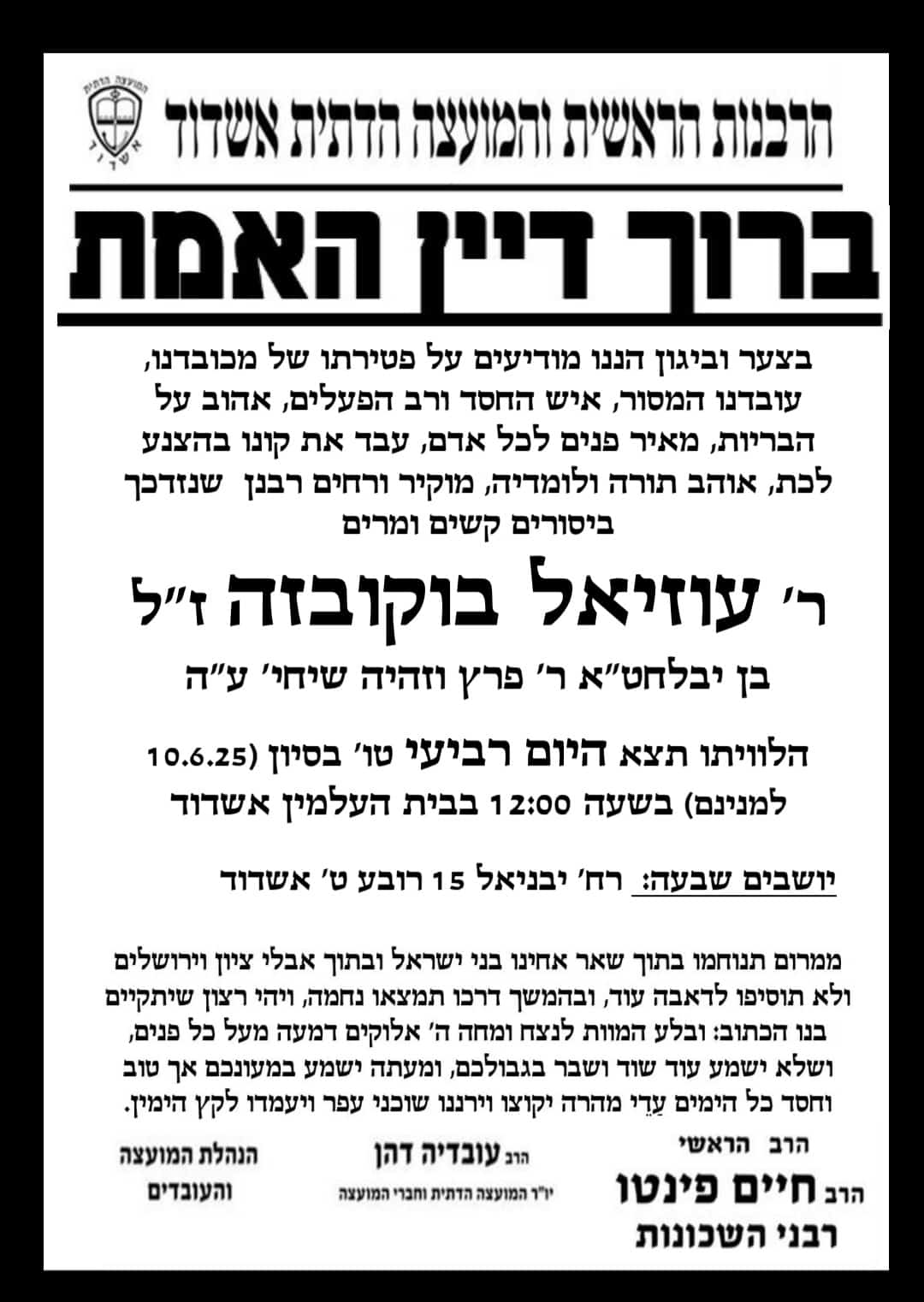 בצער רב התקבלה הבוקר הידיעה על פטירתו של אוהב תורה ולומדיה, מוקיר ורחים רבנן ר' עוזיאל בוקובזה ז"ל שנזדכך ביסורים קשים ומרים כשהוא בן סב' שנים בלבד.