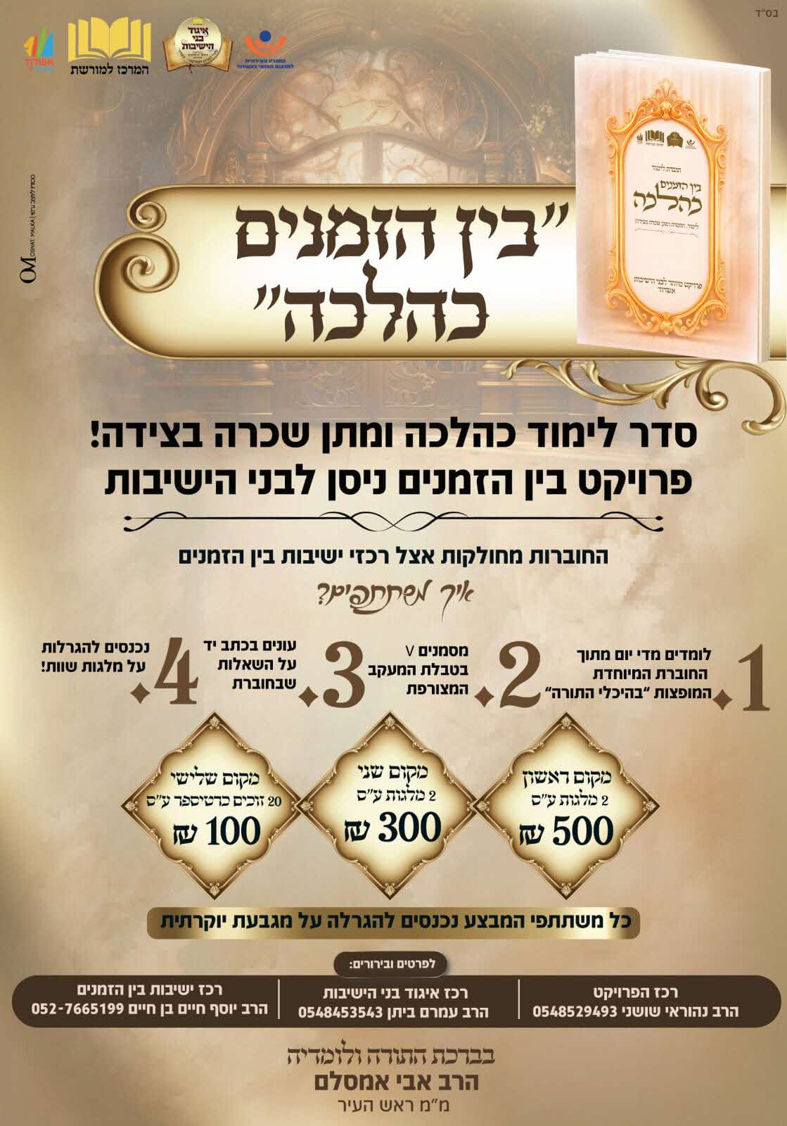 לקראת בין הזמנים הממשמש ובא ובמטרה לחזק את לימוד התורה בקרב בני הישיבות, בפרט בימים אלו, השיקו 'איגוד בני הישיבות והכוללים' ו'המרכז למורשת' בראשות מ"מ ראש העיר הרב אבי אמסלם פרויקט ייחודי נושא פרסים ללימוד הלכות מעשיות ופרקטיות הרלוונטיות לימי בין הזמנים.