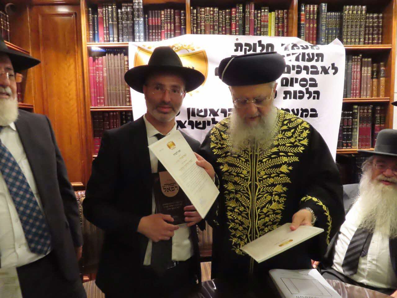 חולקו תעודות הסמכה ל'מפקחי עירובין' שהשתתפו בשיעורים של הגר"ח קלמנוביץ רב מחלקת עירובין. מרן הגר"ד יוסף: "המלצתי שחוברות ההדרכה של הגר"ח קלמנוביץ אלו ישמשו כחלק ממבחני הרבנות הראשית בהלכות עירובין"