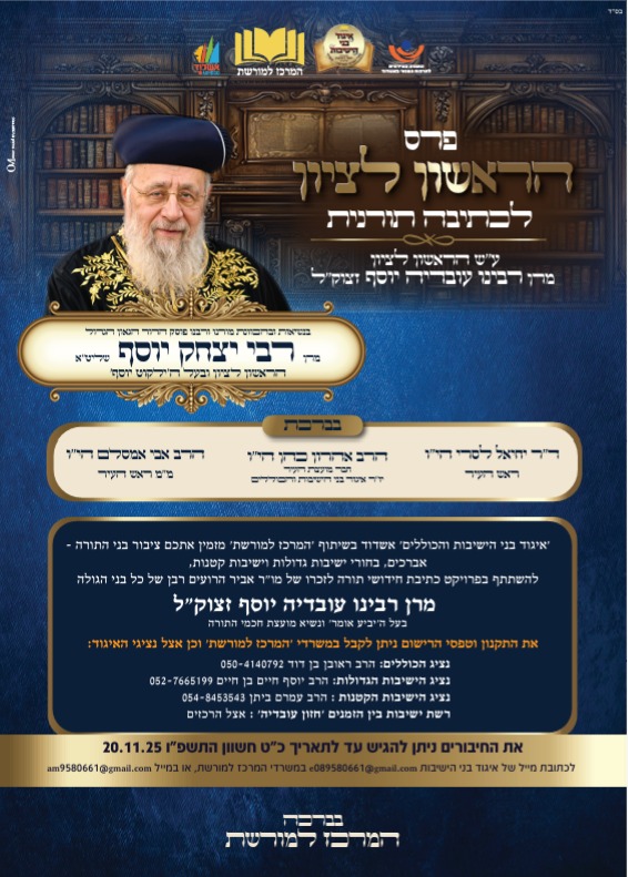 אחרי הכנס האדיר שהתקיים בסימן סיום בין הזמנים וראש חודש אלול, ב'מרכז למורשת' בראשות מ"מ ראש העיר הרב אבי אמסלם לא מבזבבזים זמן וכבר משיקים מחזור חדש של מיזם "פרס הראשון לציון לכתיבה תורנית" בשיתוף "איגוד בני הישיבות והכוללים" בראשות חבר מועצת העיר הרב אהרון כהן.