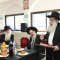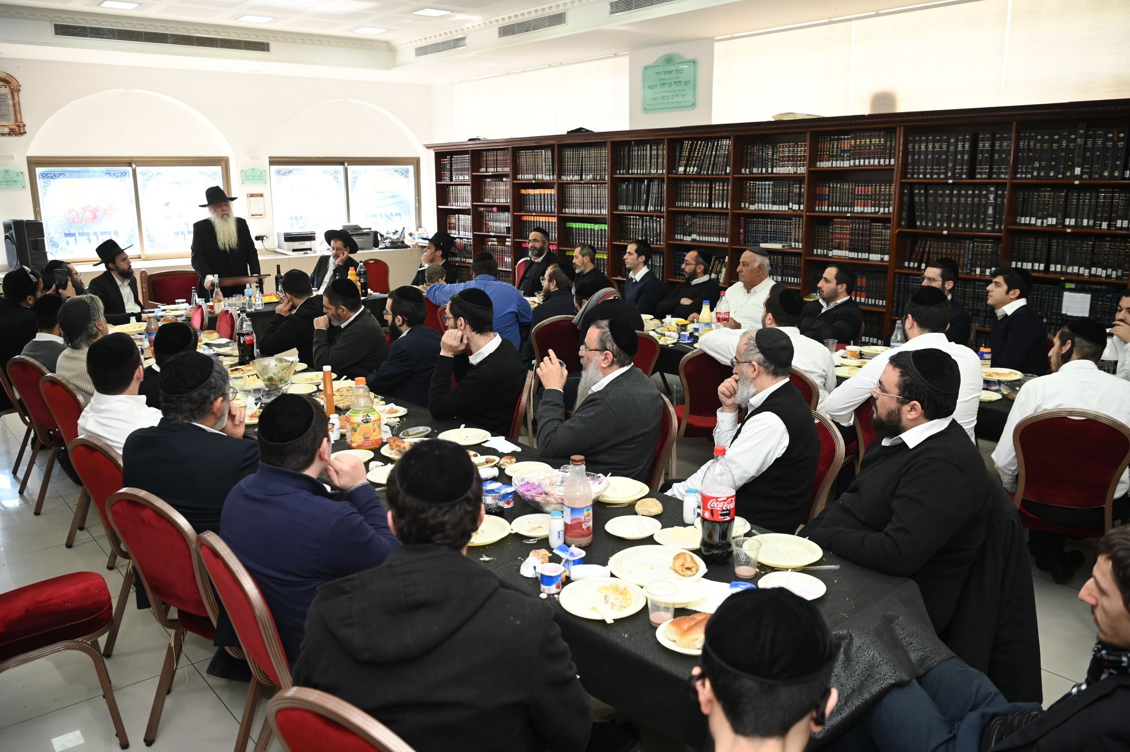 אברכי הכולל והמשתתפים בסיום המסכת היסבו לסעודת מצוה סביב שולחנות ערוכים בארוחת בוקר עשירה.