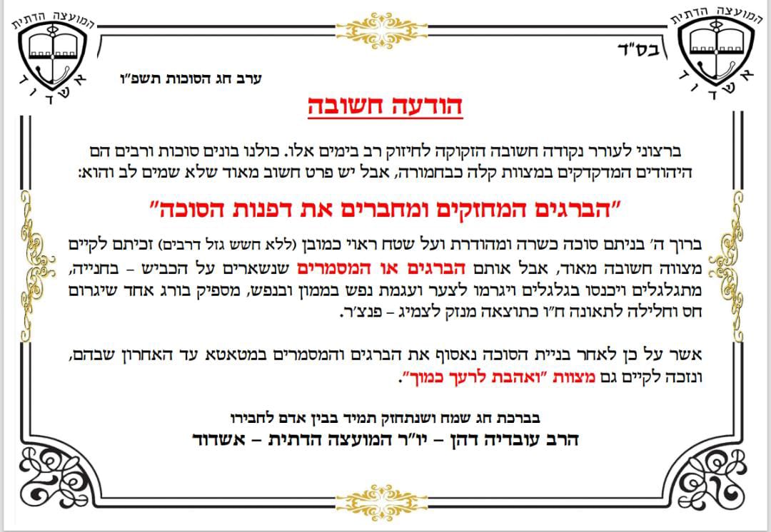 יו"ר המועצה הדתית קרא לתושבים: "לאחר בניית הסוכה נאסוף את הברגים והמסמרים במטאטא עד האחרון שבהם, ונזכה לקיים גם מצוות 'ואהבת לרעך כמוך'".