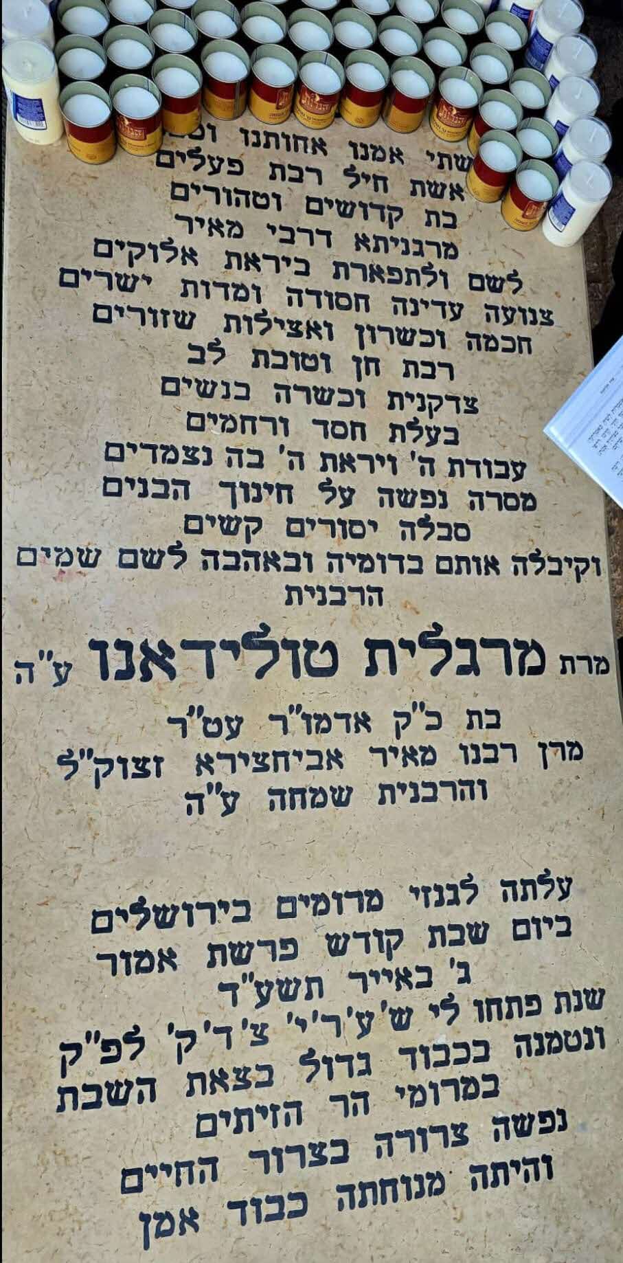 לאחר התפילות על הציון, הדליקו נרות על קברה וערכו תפילות לישועת הכלל והפרט, הגר"ש טולידאנו בירך את כל המשתתפים ואת כל עם ישראל הנמצאים בימים לא פשוטים שזכות הרבנית הצדקנית ע"ה תעמוד להם לישועה ורחמים.