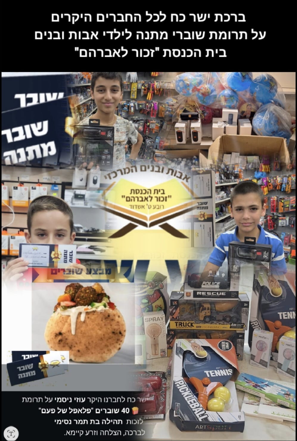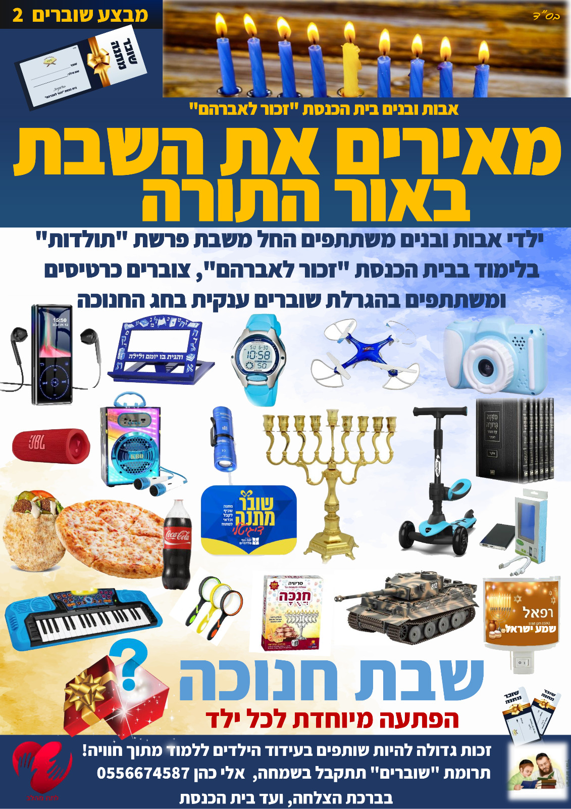 "המיזם נועד לעודד את הדור הצעיר להגיע ללימוד עם אבא, לטעום ממתיקות התורה ולהפוך את השבת לחוויה משפחתית של קדושה. כל ילד מקבל כרטיס השתתפות, ובשבת חנוכה תתקיים הגרלה על שוברים ופרסים יקרי ערך – מתנת תורמים מהקהילה".