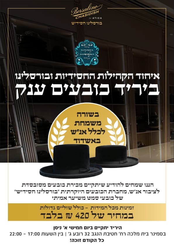 היום החל מהשעה 17.00 תתקיים מכירת הנעליים והכובעים המוזלת ביוזמת "שלומי אמונים" ו"מחזיקי הדת"