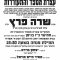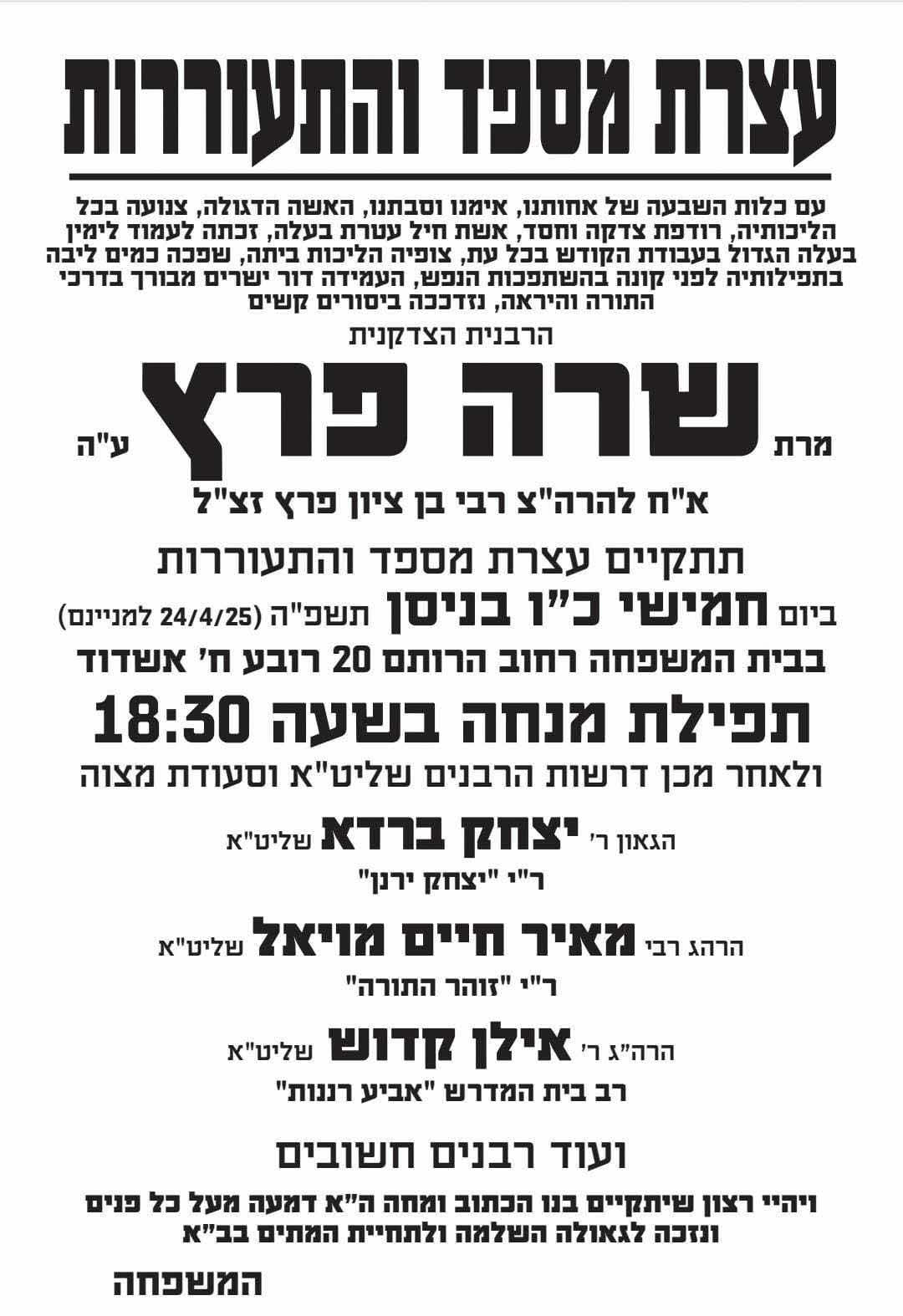 עם צאת השבת וחג שביעי של פסח, הגיעה הבשורה המעציבה על פטירתה של הרבנית הצדקנית הדגולה והחסודה, אשת חיל אשר זכתה לעמוד לימין בעלה הגדול בעבודת הקודש בכל עת, צופיה הליכות ביתה, שפכה כמים ליבה בתפילותיה לפני קונה בהשתפכות הנפש, העמידה דור ישרים מבורך בדרכי התורה והיראה, מרת שרה פרץ ע"ה רעיתו של הרה"צ רבי בן ציון פרץ זצ"ל שהשיבה נשמתה לבוראה לאחר יסורים קשים והיא בת עה' שנים.