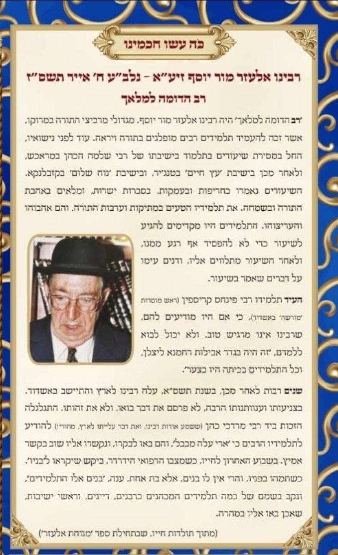 בשעת הצהריים התאספו תלמידיו ומוקירי זכרו של הגאון הגדול חכם רבי אלעזר מור יוסף זצ"ל ראש ישיבת "נוה שלום" קזבלנקה וממקימי עולה של תורה במרוקו, במלאת יט' שנים, על קברו שבבית העלמין בחלקת הרבנים באשדוד בסמוך לחלקה הצבאית.