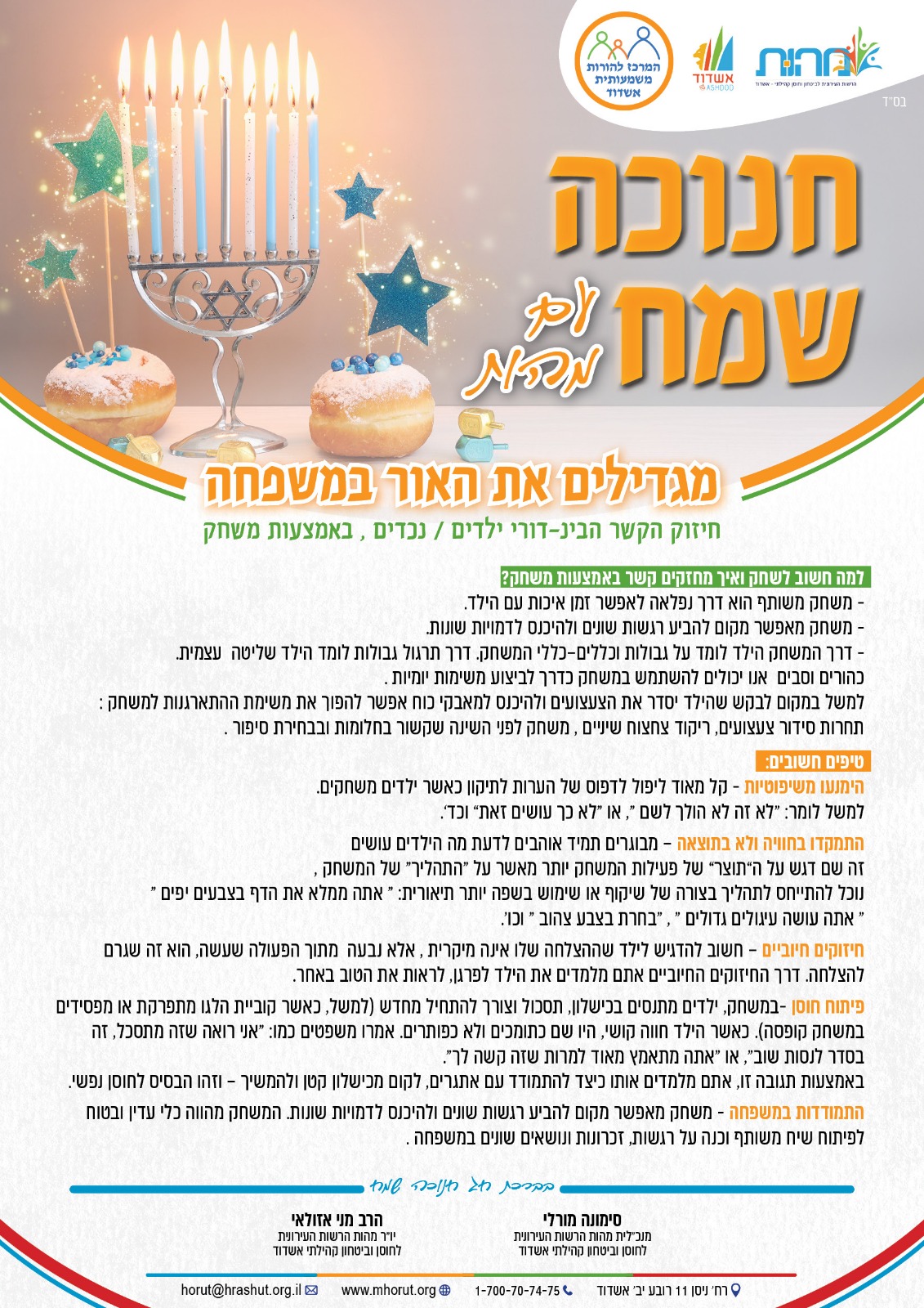 בחנוכה האחרון, כאשר אורות החנוכיות האירו את הבתים, התקיימה באשדוד יוזמה קהילתית מרגשת במיוחד. ביוזמתם של חבר מועצת העיר ויו”ר מהות, הרב מני אזולאי, וגב׳ סימונה מורלי, מנכ״לית הרשות העירונית לחוסן וביטחון קהילתי אשדוד, יצא לפועל המיזם “מגדילים את האור במשפחה”, שהוקדש השנה כולו למשפחות שכולות ממלחמת חרבות ברזל. במהלך ימי החנוכה יצאו עובדי ומתנדבי מהות לבתיהן של משפחות שאיבדו את היקר להן מכל. הם הגיעו עם ערכות משחקים משפחתיות המותאמות לכל הגילאים – אך בעיקר עם לב פתוח ורגישות גדולה. הביקורים הפכו למפגשים משפחתיים מחברים, שאפשרו רגעים של משחק, חיוך וחיבור מחודש בין הורים לילדים, בין סבים לנכדים ובין אחים. עובדי מהות מספרים בהתרגשות כי המשפחות קיבלו את היוזמה בהוקרה גדולה, ושיתפו בתחושת חום ואכפתיות עמוקה על כך שמישהו חשב עליהן דווקא ברגעים המורכבים ביותר. “ראינו בעיניים איך המשחק יוצר חיבור,” סיפר אחד העובדים, “איך העצב מפנה מקום, אפילו לזמן קצר, לצחוק ולקרבה. זה לא מובן מאליו”.