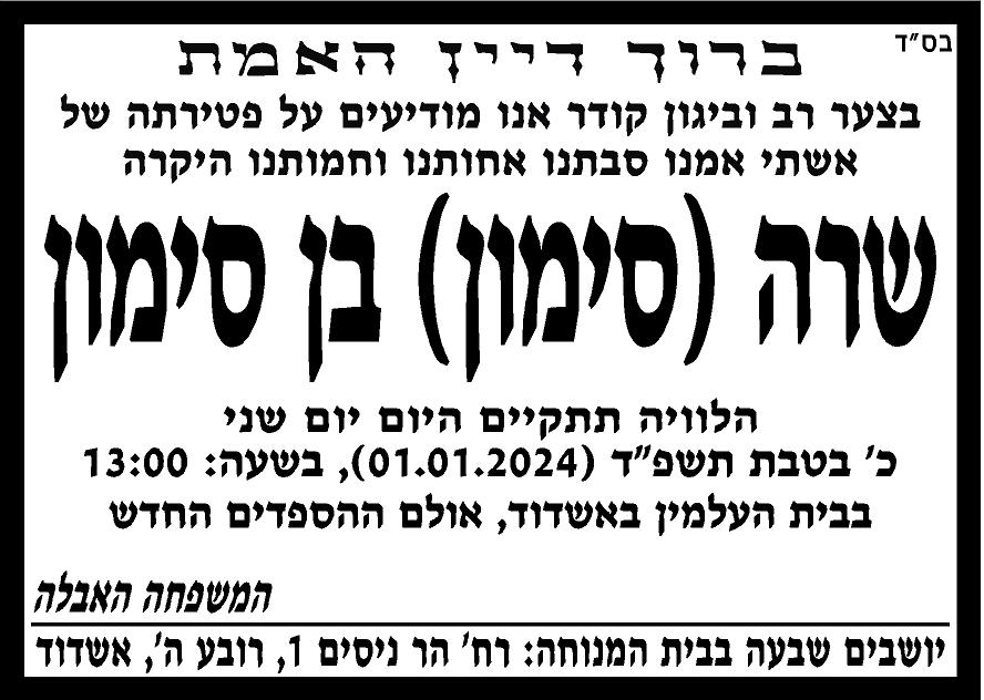 בגיל 71 הלכה לעולמה מרת שרה (סימון) בן סימון ע"ה. הייתה ספרית ובעלת סלון כלות מוכרת מאוד בעיר. הלוויתה תתקיים בצהריים באשדוד. המנוחה היא אמו של עורך הדין הרב מאיר בן סימון, שכיהן כחבר מועצה מטעם ש״ס באשדוד