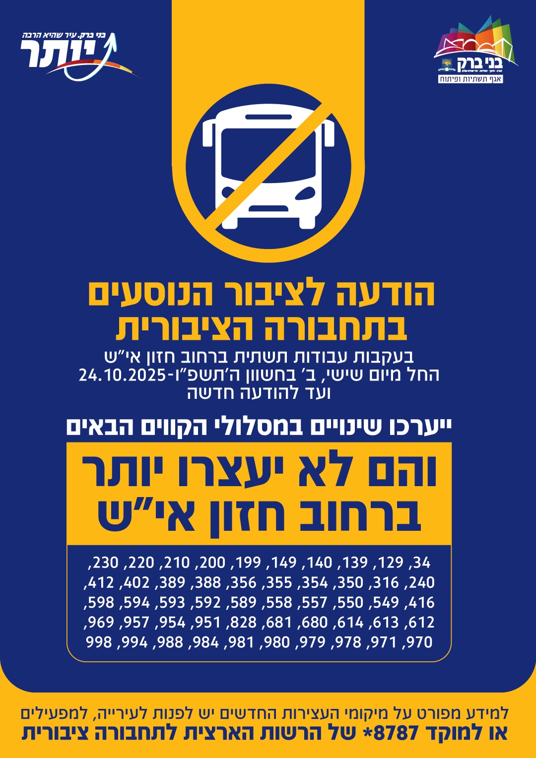 נוסעים לב"ב? לכו ברגל: בשל הודעה של עיריית ב"ב לפיה החלו עבודות תשתית בעורק החיים הראשי של ב"ב, רחוב חזו"א, יוסטו כל הקווים שעד כה עברו ברח' חזו"א והם ינועו מעתה במסלולים חלופיים.