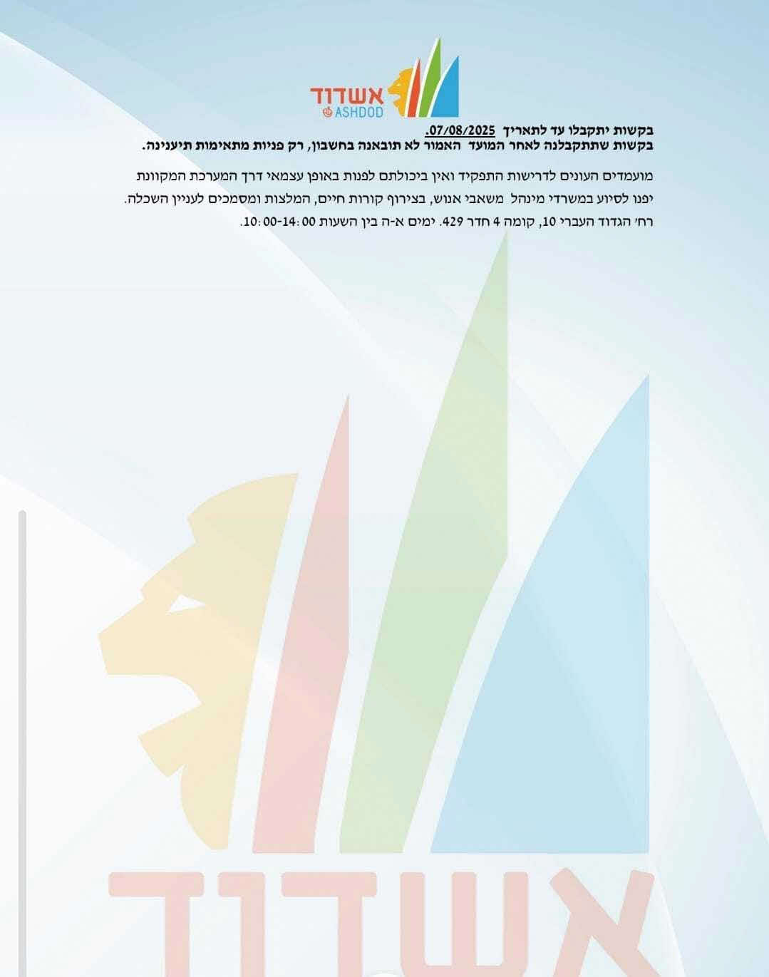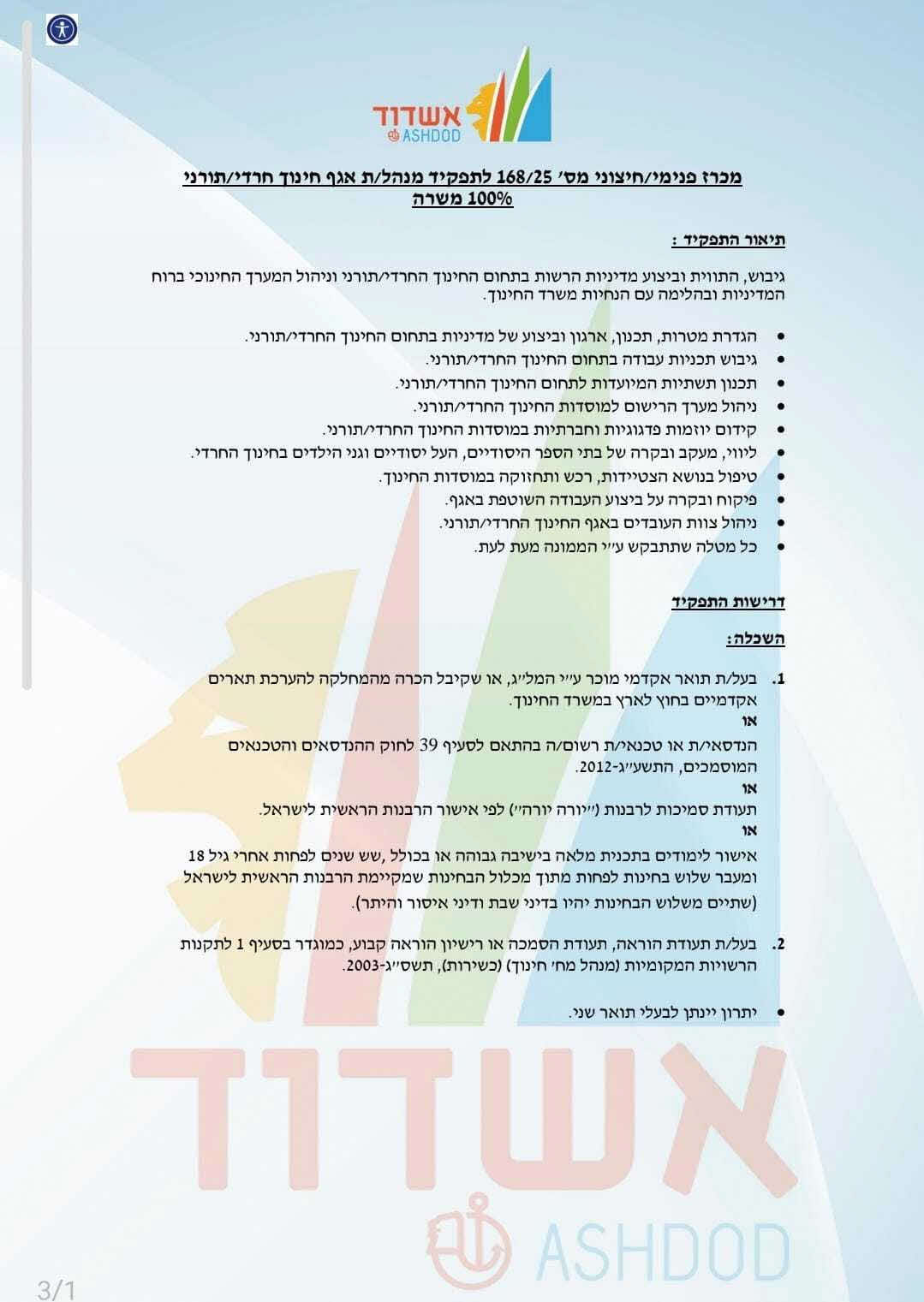 עתה, כאמור, מודיעה העיריה על פתיחת המכרז לתפקיד, כשאין ספק כי מדובר בתפקיד שנחיצותו רבה עבור מוסדות החינוך החרדי שמספר תלמידיהם עומד על יותר מ50% ממספר התלמידים בעיר.