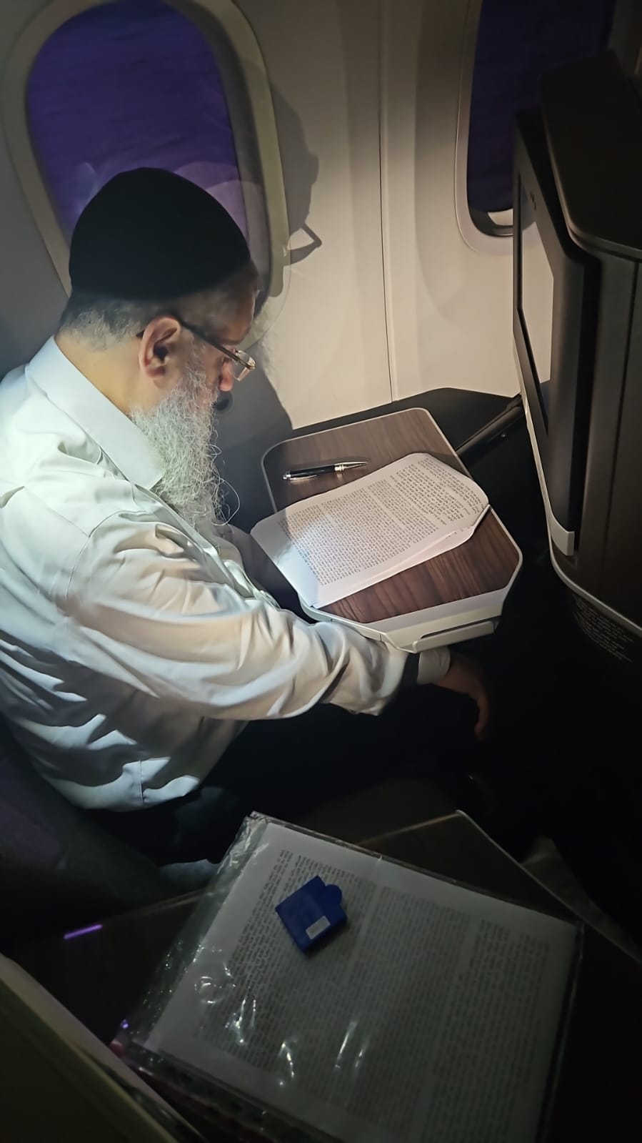ניסיתי לגשת לקבל ברכה או לשאול שאלה בהלכה, אך לא היה שייך כלל מכיוון שהרב היה שקוע עמוק בכל מהלך הטיסה הארוכה בתוך תכריך כתביו להגהת הספר, ככל הנראה הכרך ה-21 שיצא בזמן הקרוב.
