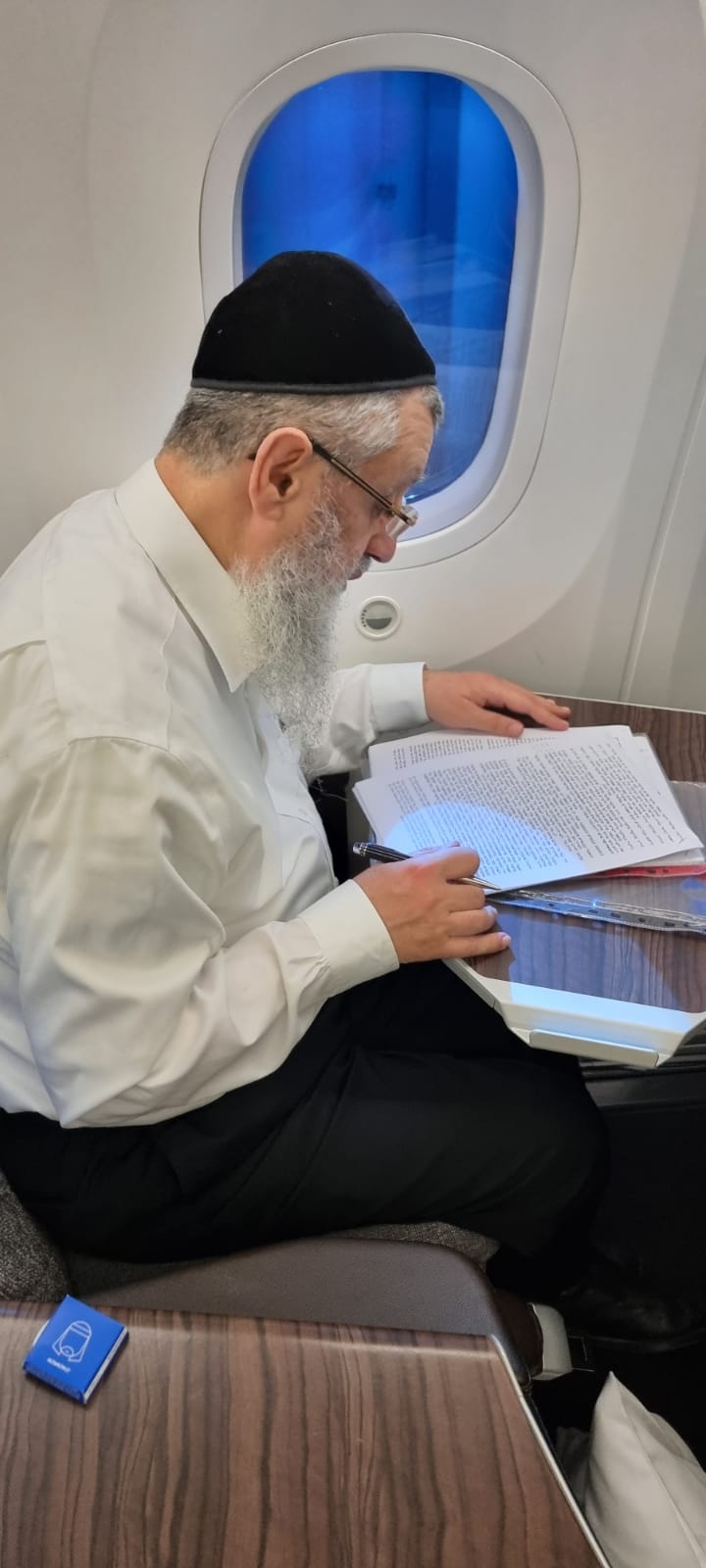 מדהים היה לראות שכבר עוד לפני העליה למטוס, ראיתי את הרב שליט"א בעת ההמתנה במעבר הדרכונים, עם חבילת דפים שעובר עליהם שורה אחר שורה כשמידי פעם עוצר וכותב הערות בצד הדף.