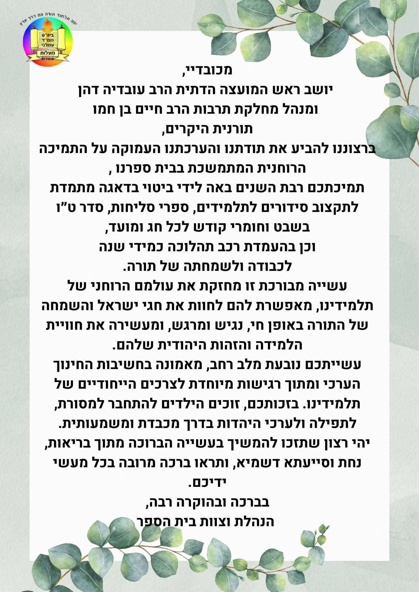 בבי"ס "מעלות אשדוד": יו"ר המועה"ד חילק סידורים וריגש את התלמידים