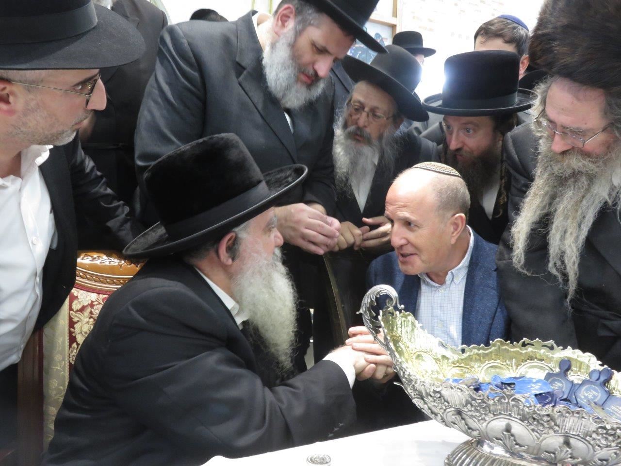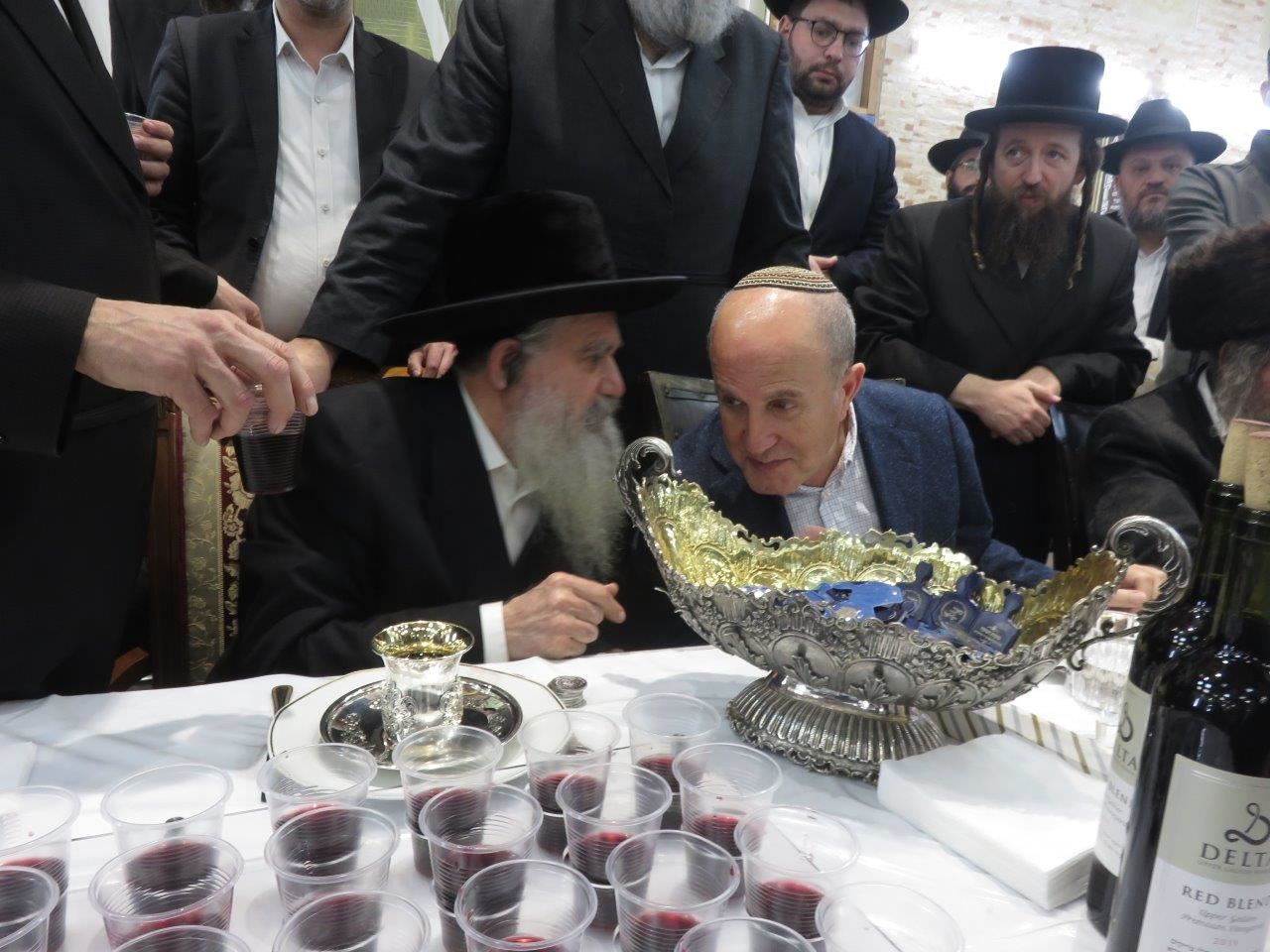 בסיום דברי התורה הקהל עבר בהמוניו לקבלת ברכה, כשלפני כולם העניק האדמו"ר כוס של ברכה לראש העיר ד"ר יחיאל לסרי ומטבע ברכה לשמירה כשהוא מברכו "שיראה ברכה בכל מעשי ידיו, יעלה ויצליח בזכות האורות הגדולים של ימי החנוכה".