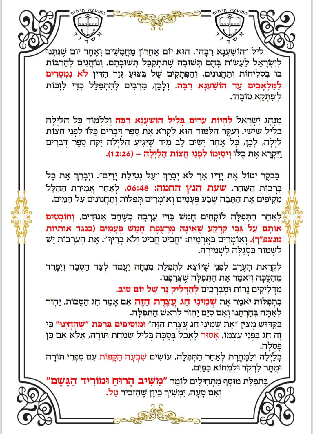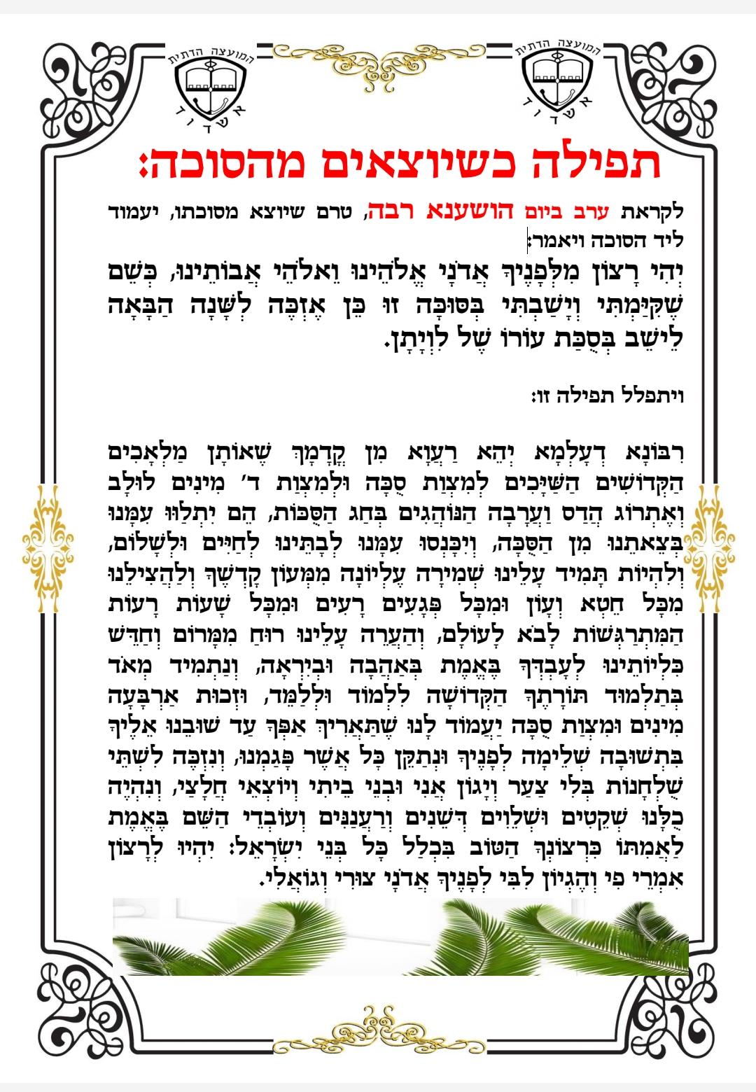 במועצה הדתית פרסמו את ההכנות לקראת יום קדוש זה והזמנים החשובים של חצות לילה ונץ החמה, מנהג חביטת הערבה והלכות קצרות של חג שמחת תורה ותפילה מיוחדת לפני שנפרדים מהסוכה המובאת בספרים הק' שצריך להתפלל שנזכה שהמלאכים של המצווה ילוו אותנו כל השנה לטובה ולברכה ולשמירה לעשות עבודתו יתברך עטופים ומסובבים באמונה וקשר עם השם יתברך – כמו שהסוכה סיככה עלינו כל ימי החג.