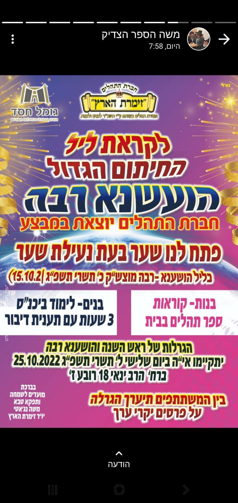 אמירת תהלים ב'יומא דדוד': במוצאי שבת, ליל הושענא רבא, יתאחדו ילדי וילדות אשדוד באמירת תהלים, זאת ביוזמת ארגון 'זמרת הארץ' של הספר הצדיק, ר' משה נגטי.