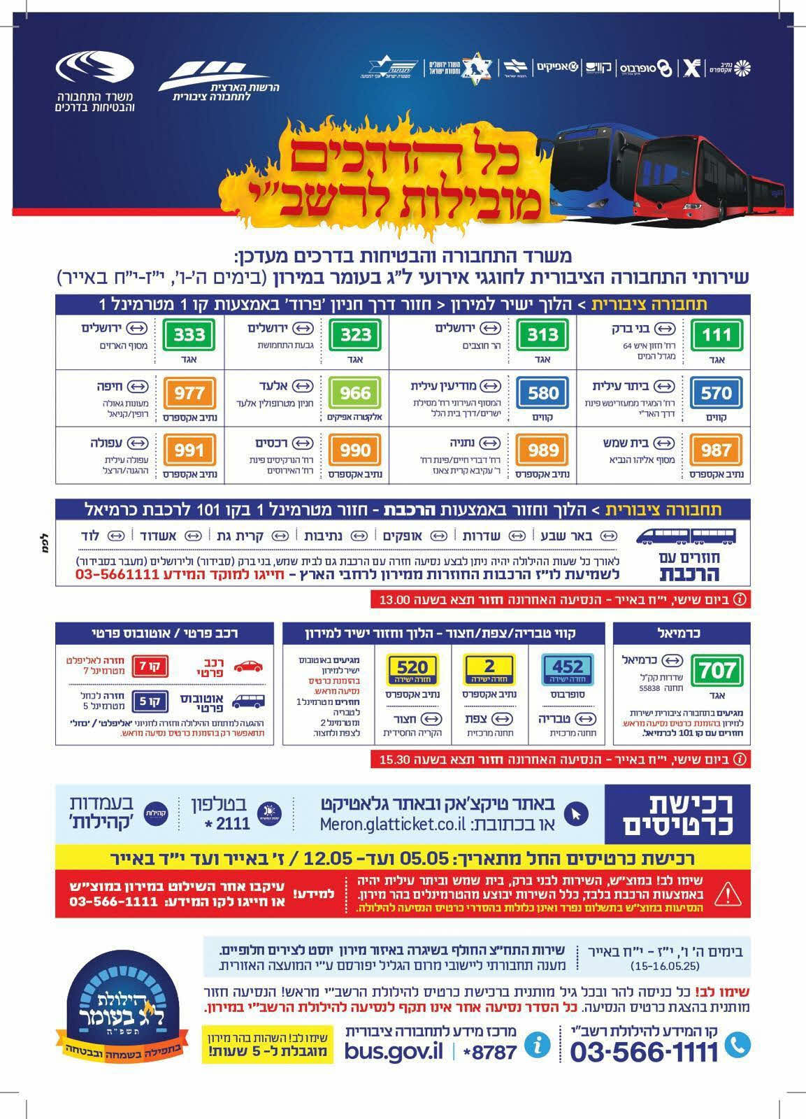 כל הדרכים מובילות לרשב"י: משרד התחבורה בפריסת ענק - מאות אוטובוסים מכל רחבי הארץ ורכבות שיפעלו לאורך כל הלילה, יובילו את רבבות המתפללים להר | פורסם מערך התחבורה הציבורית ודרכי ההגעה למירון לקראת הילולת ל"ג בעומר הבעל"ט שתתקיים בימים חמישי–שישי, י"ז–י"ח באייר תשפ"ה (15-16/05/2026).