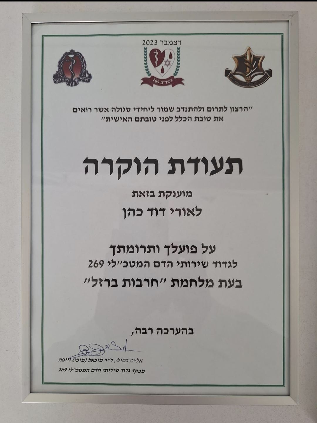 גאווה: הצעיר האשדודי קיבל תעודות הערכה על פועלו במלחמת חרבות ברזל