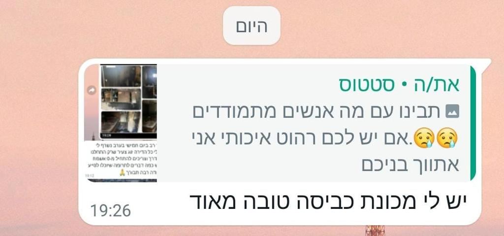 דניאל, שמפעיל גמ"ח של מוצרים יד שניה במסגרתו הוא מסייע ומתווך בין יהודים שזקוקים לרהיטים או מוצרי חשמל לבין אלו שבדיוק מוציאים חפצים אלו מבתיהם, קיבל בשבוע שעבר בקשה חריגה. הפונה, אשה צעירה מרחובות, כתבה כי "נישאנו ממש כעת, אך תכולת הדירה עלתה כולה בלהבות. עכשיו אין לנו כלום ואנו מתחילים מאפס".