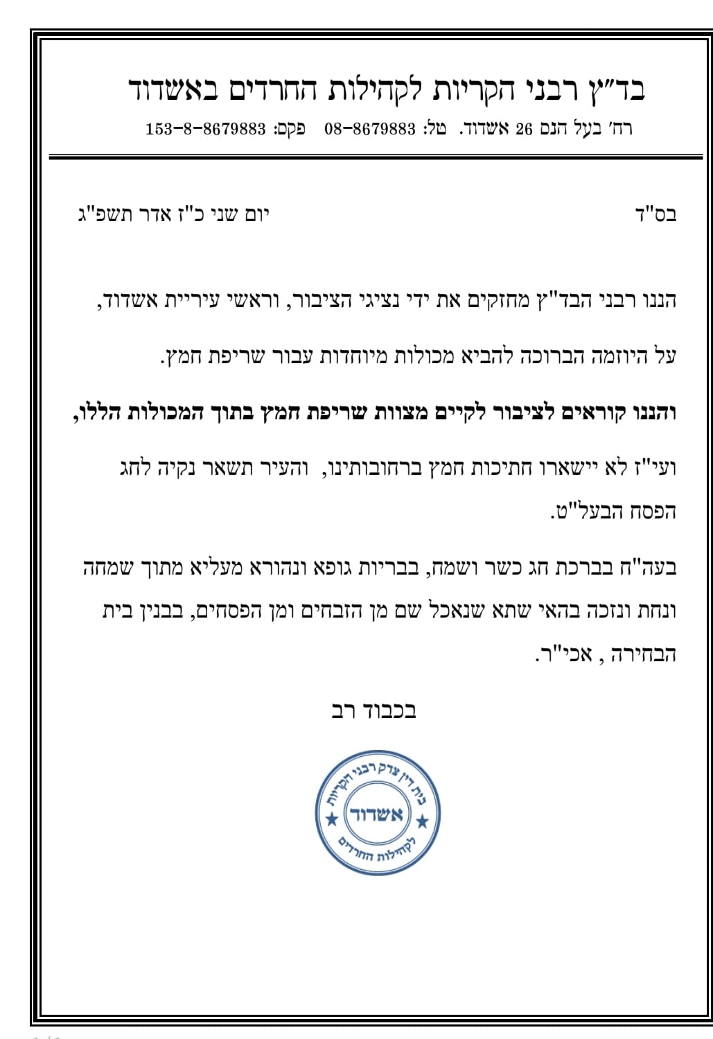 יו"ר מינהלת רובע ז' ר' אברהם ליבוביץ מפרסם את מכתב הרבנים הקובעים כי השנה תותר שריפת חמץ רב במכולות. "כך נמנע פגיעה בבריאות התושבים"