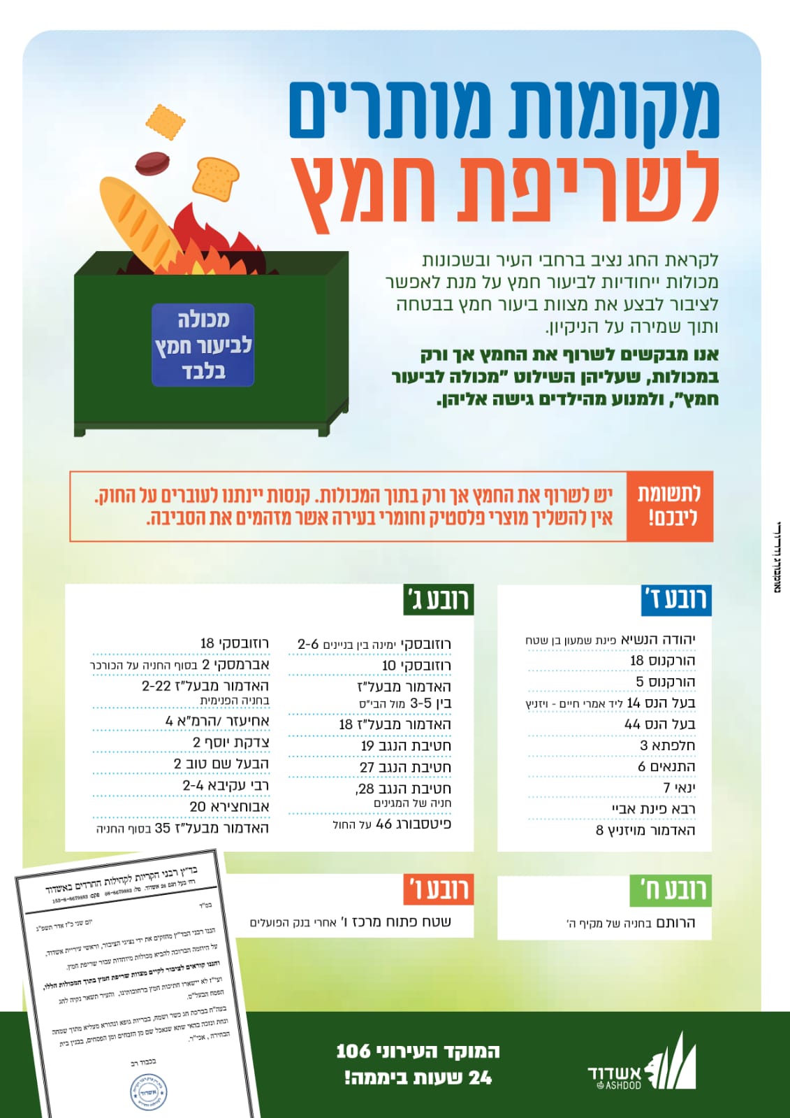 ערב פסח עם אוויר נקי: ביוזמת יו"ר מינהלת רובע ז' ר' אברהם ליבוביץ תעמיד העיריה מכולות ייעודיות לשריפת חמץ בערב הפסח.