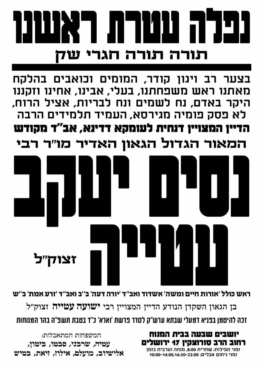 בערב שבת הגיעה הידיעה מירושלים על הסתלקותו של אחד משרידי דור דעה, שייף עייל שייף נפיק ולא מחזיק טיבותא לנפשיה, הדיין הגאון ניסים יעקב עטיה זצ"ל ראש הכולל "אורות חיים ומשה" אשדוד והוא בן 75 בפטירתו לאחר שסבל בחודשים האחרונים מזיהום חמור בכליות.