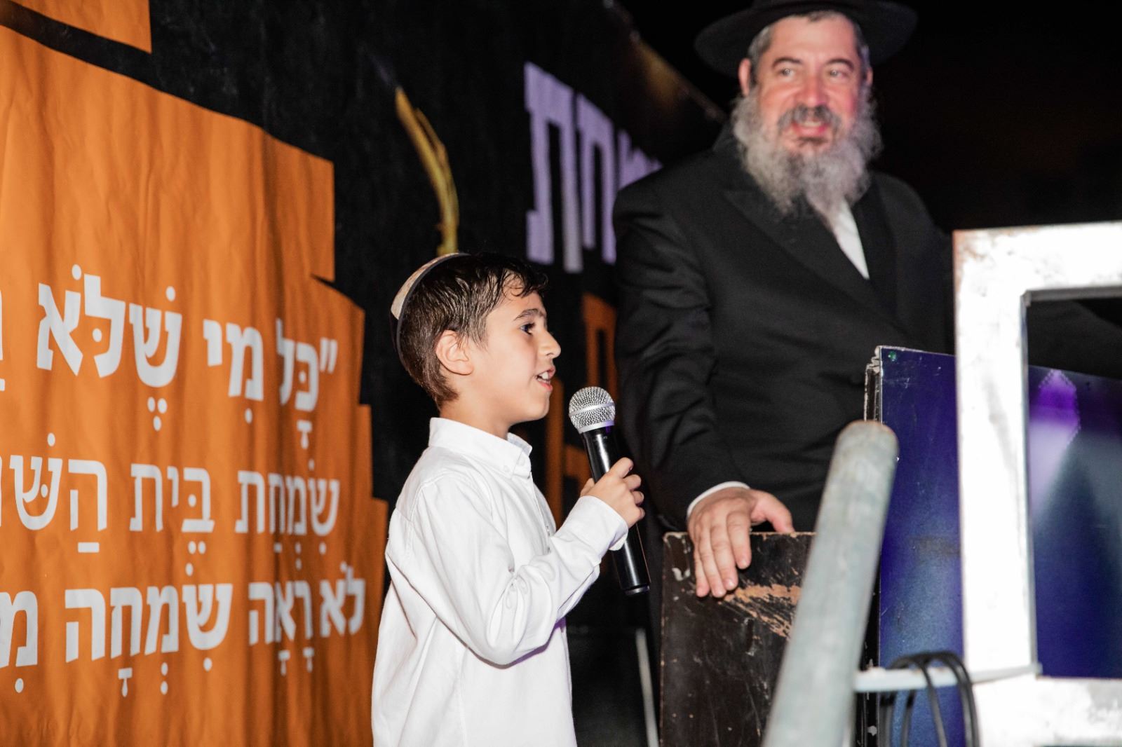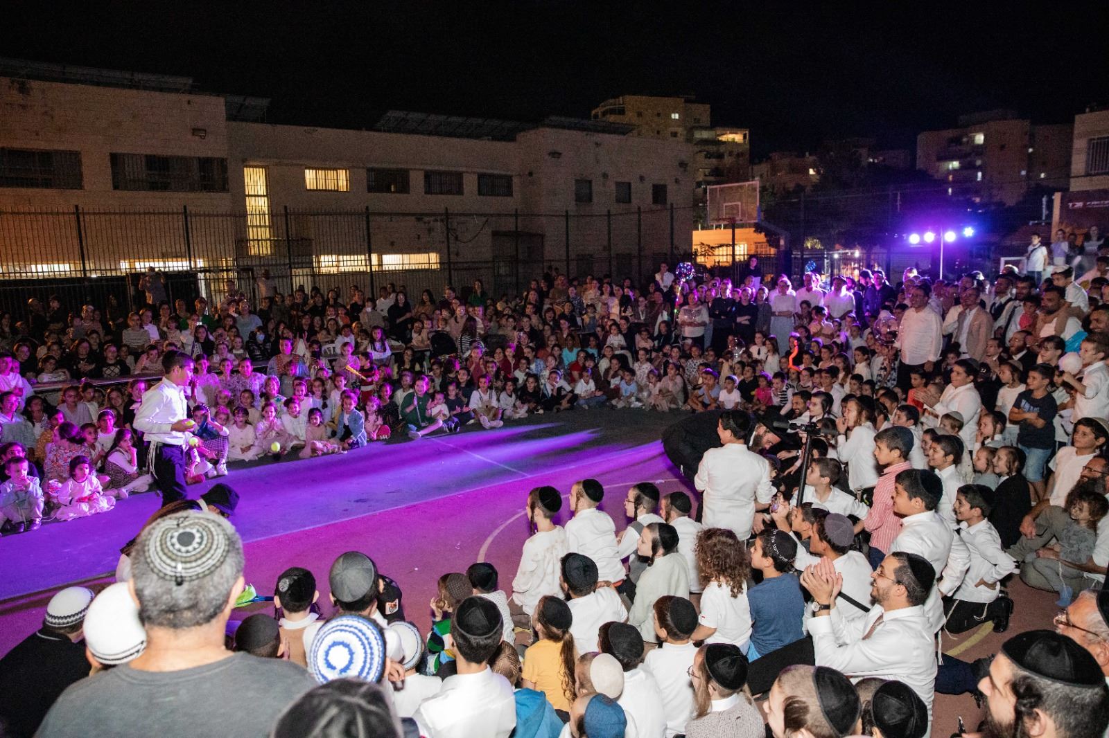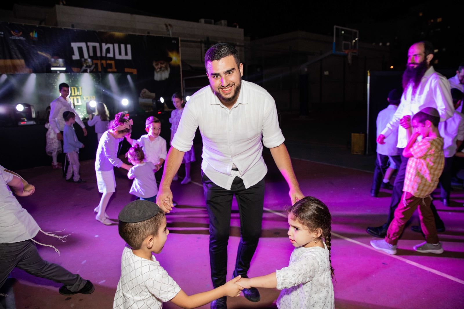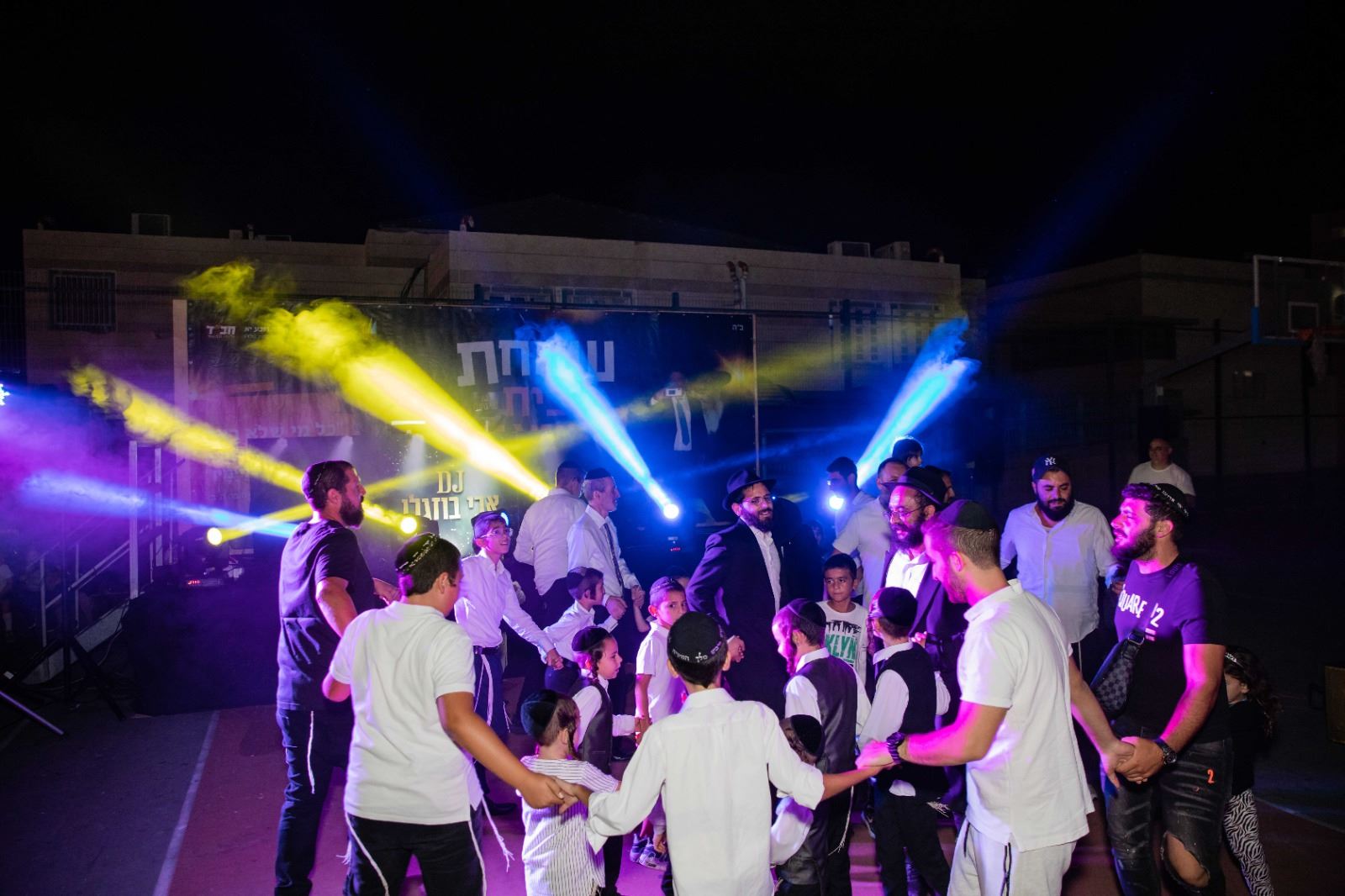 מסורת של שמחה ברחובה של עיר: למעלה מ-1000 הורים וילדים השתתפו בשמחת בית השואבה של חב"ד ברובע י"א תחת ניצוחו של רב השכונה הרב מרדכי לאופר שליט"א