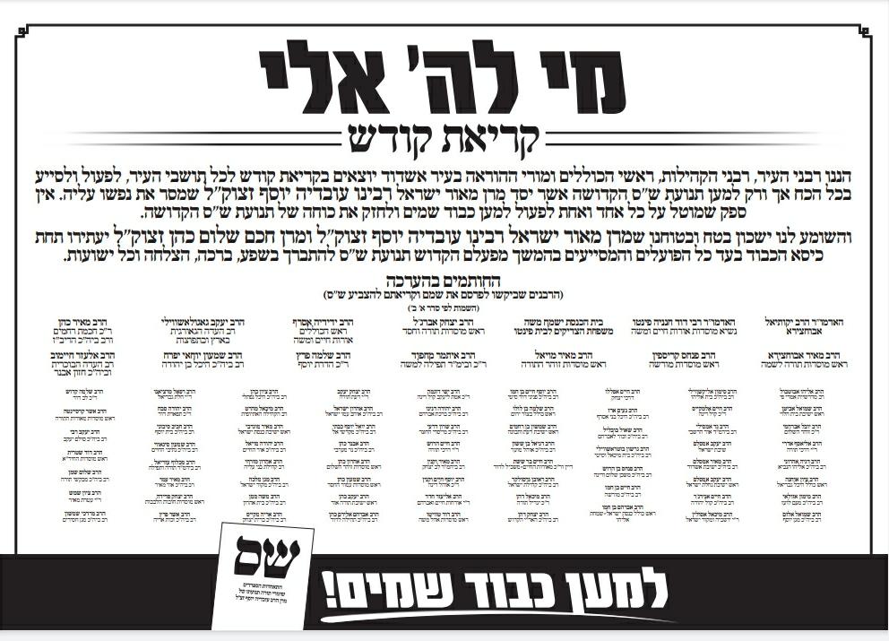 כל רבני ואדמו"רי הקהילות הספרדיות, מקיר לקיר, ובראשם אדמו"רי משפחת אבוחצירא - חתמו על 'קול קורא' נלהב למען תנועת ש"ס. "חובה לפעול ולהפעיל"