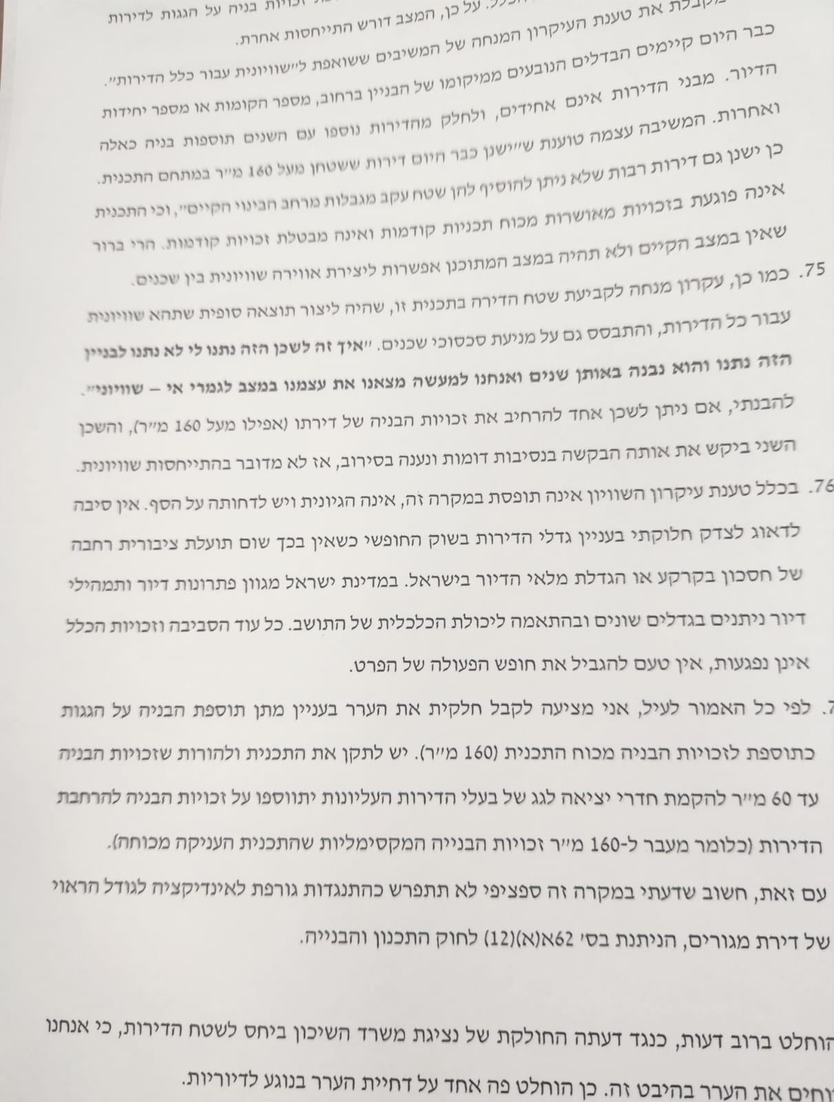 הועדה הוסיפה, כי קביעתה של התכנית כי ניתן יהיה להרחיב את הדירות עד ל-160 מ"ר היא אפוא קביעה שיש לברך עליה. מדובר בשטח ניכר, נרחב ומכובד שיבטיח תנאי מחיה נאותים.