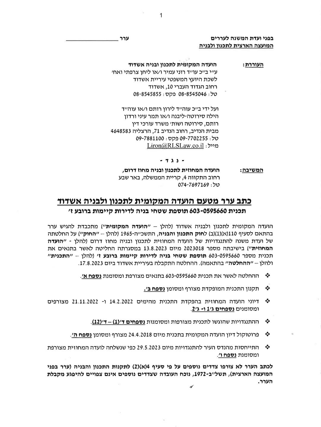 תחילתו של הסיפור, כאשר תושבים ברובע ז' הגישו ערר באמצעות המח' המשפטית של עיריית אשדוד ערר רישוי אשר תוקף את החלטת הועדה המחוזית לתכנון ובנייה באר שבע.