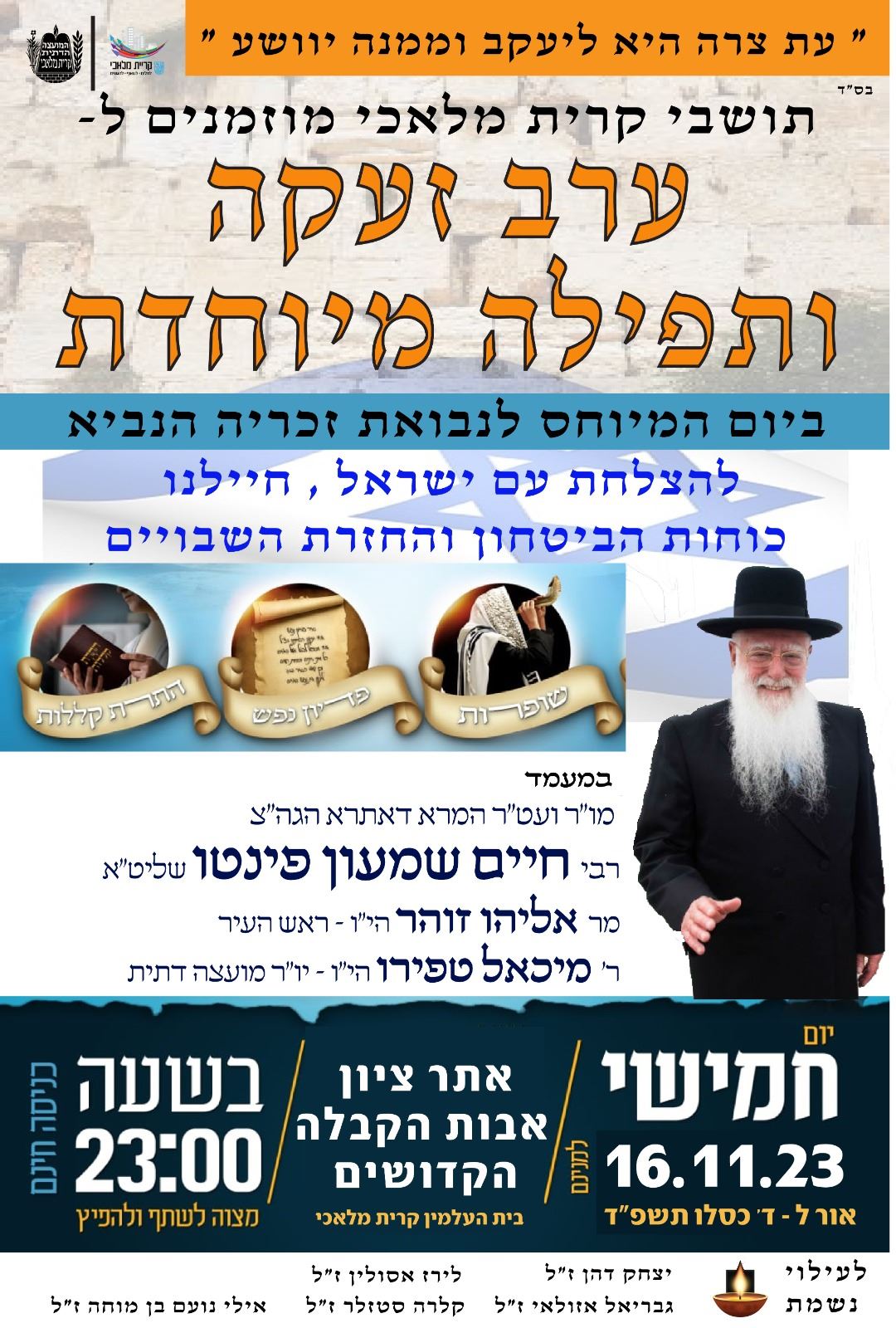 הלילה לקראת חצות בשופרות ובחצוצרות: ערב זעקה ותפילה מיוחדת  באוהל "אבות הקבלה הקדושים" בקרית מלאכי במעמד הרב הראשי הגה"צ רבי חיים שמעון פינטו שליט"א
