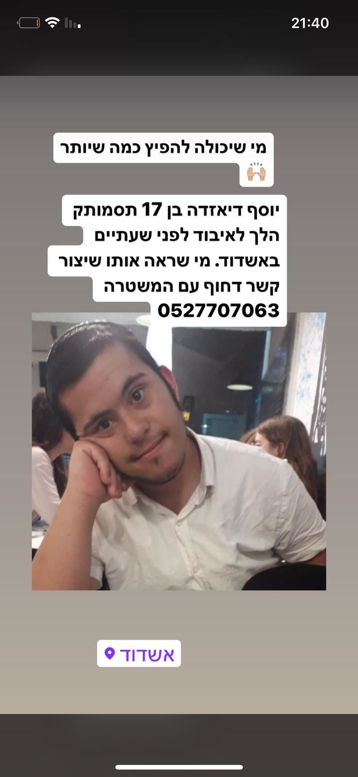 משעות אחר הצוהריים מתנהלים חיפושים נרחבים מאוד אחר הנער יוסף דאיזדה, בן 17 עם תסמונת דאון. נראה לאחרונה באזור פארק אשדוד ים. אימו מבקשת מהציבור לסייע בחיפושים: "הוא כבר רעב וצמא ולא יודע היכן הוא"