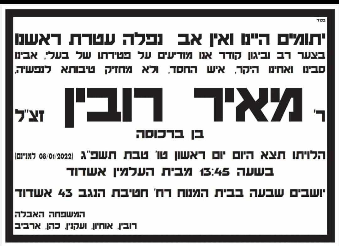 הלוויתו תתקיים היום (א) בבית העלמין באשדוד, בשעה 13.45.