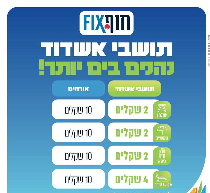 המחירים המוצעים לתושבי אשדוד בחוף הנפרד יעמדו על 2 שקלים לכיסא, שמשיה או שולחן לאורך כל היום.