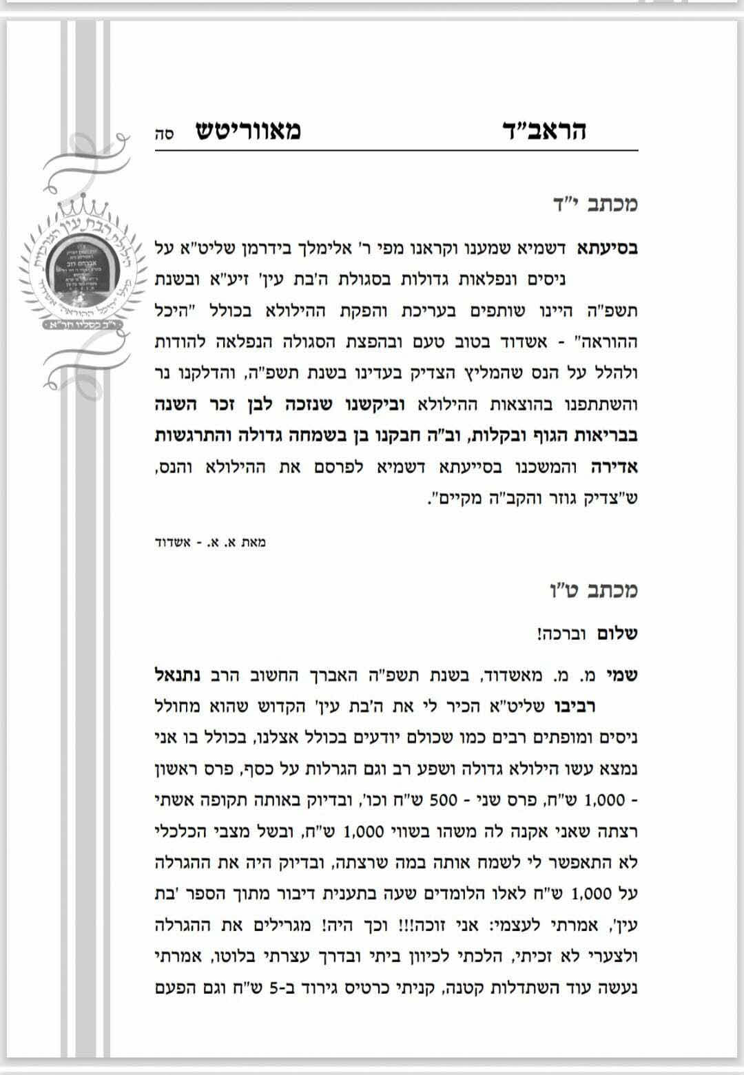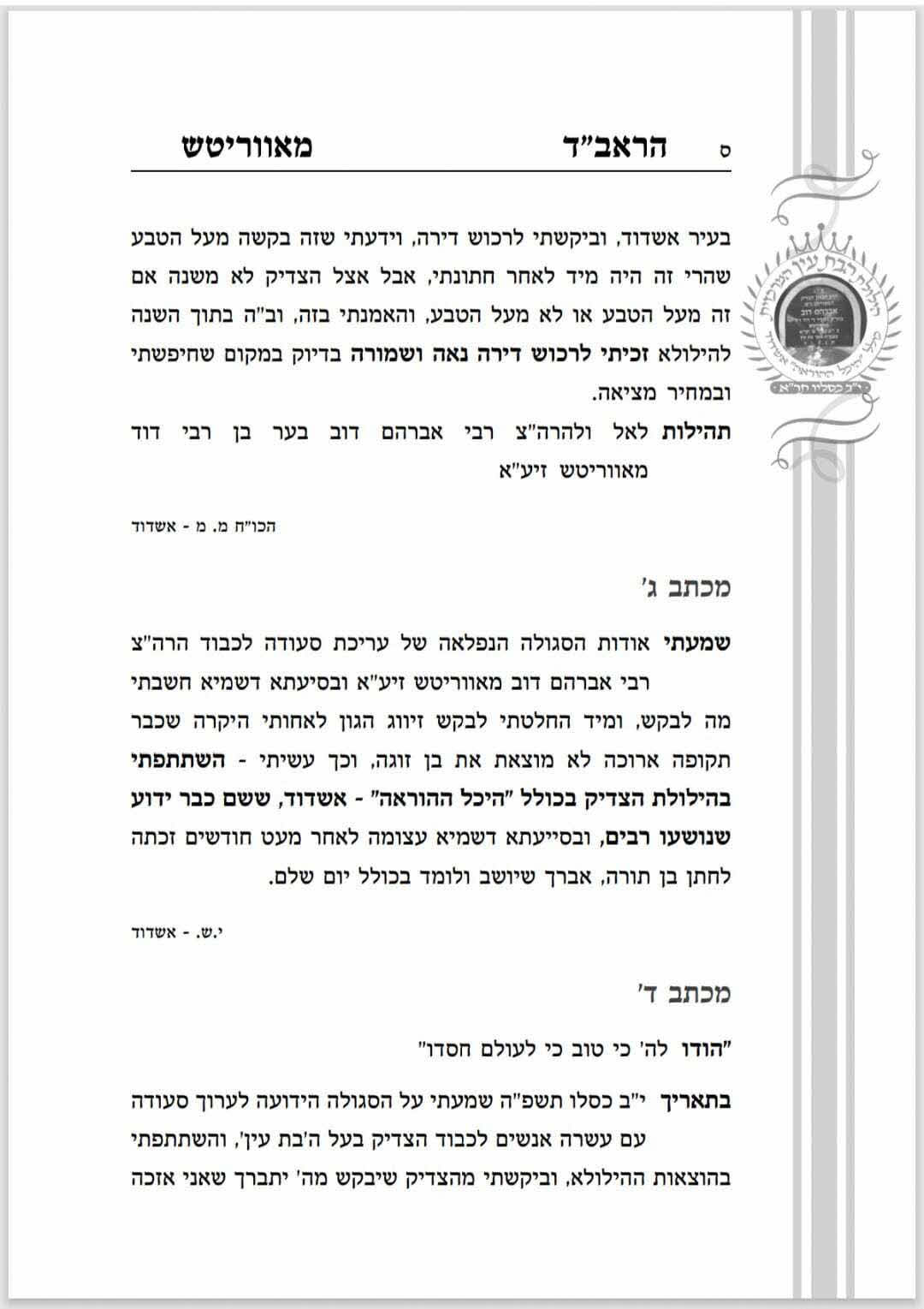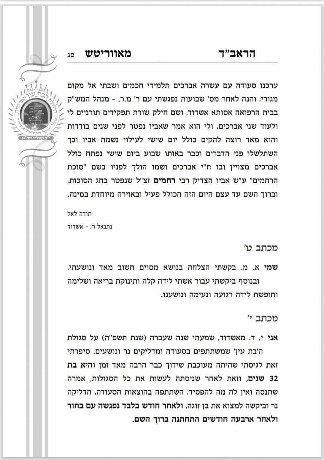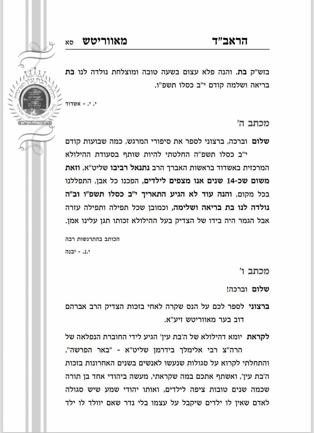 מכתב ה' - שלום וברכה, ברצוני לספר את סיפורי המרגש, כמה שבועות קודם י"ב כסלו תשפ"ה החלטתי להיות שותף בסעודה ההילולא המרכזית באשדוד בראשות האברך הרב נתנאל רביבו שליט"א, וזאת משום שכ-14 שנים אנו מצפים לילדים, הפכנו כל אבן, התפללנו בכל מקום, והנה עוד לא הגי התאריך י"ב כסלו תשפ"ו וב"ה נולדה לנו בת בריאה ושלמה, וכמובן שכל תפילה ותפילה עזרה, אבל הגמר היה בידו של הצדיק בעל ההילולא זכותו תגן עלינו אמן.
