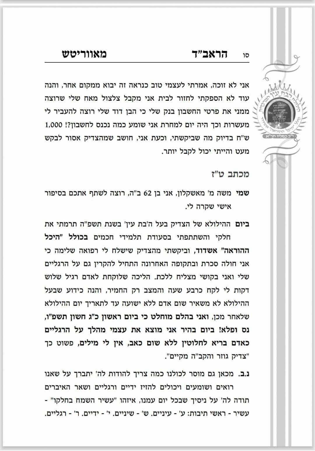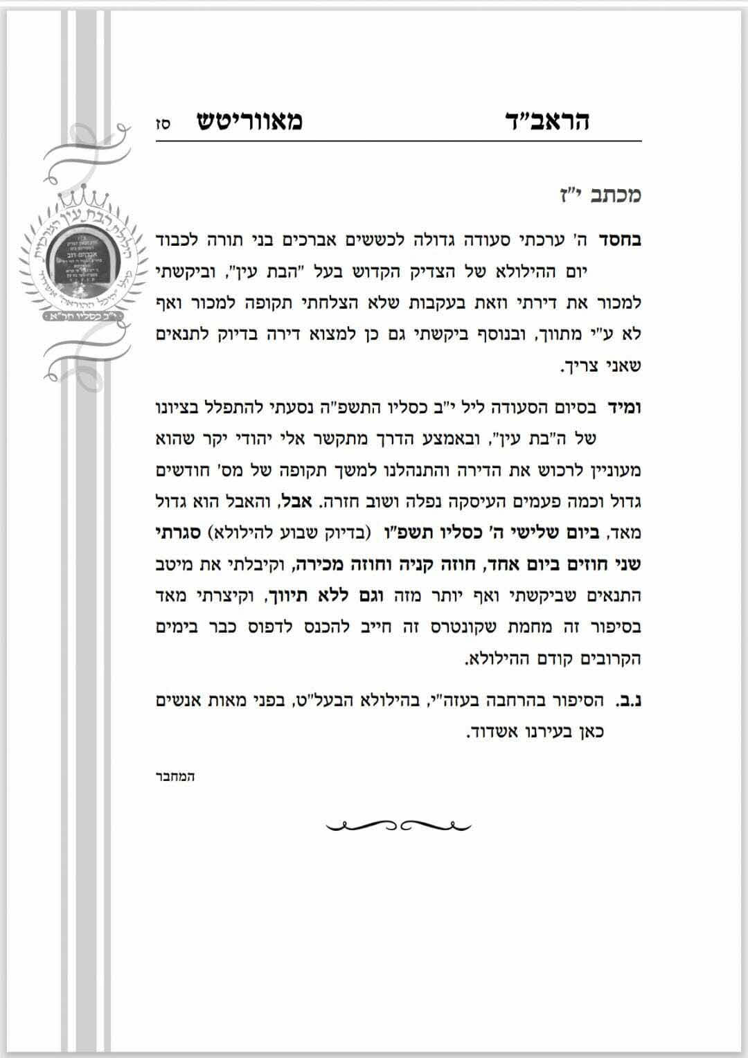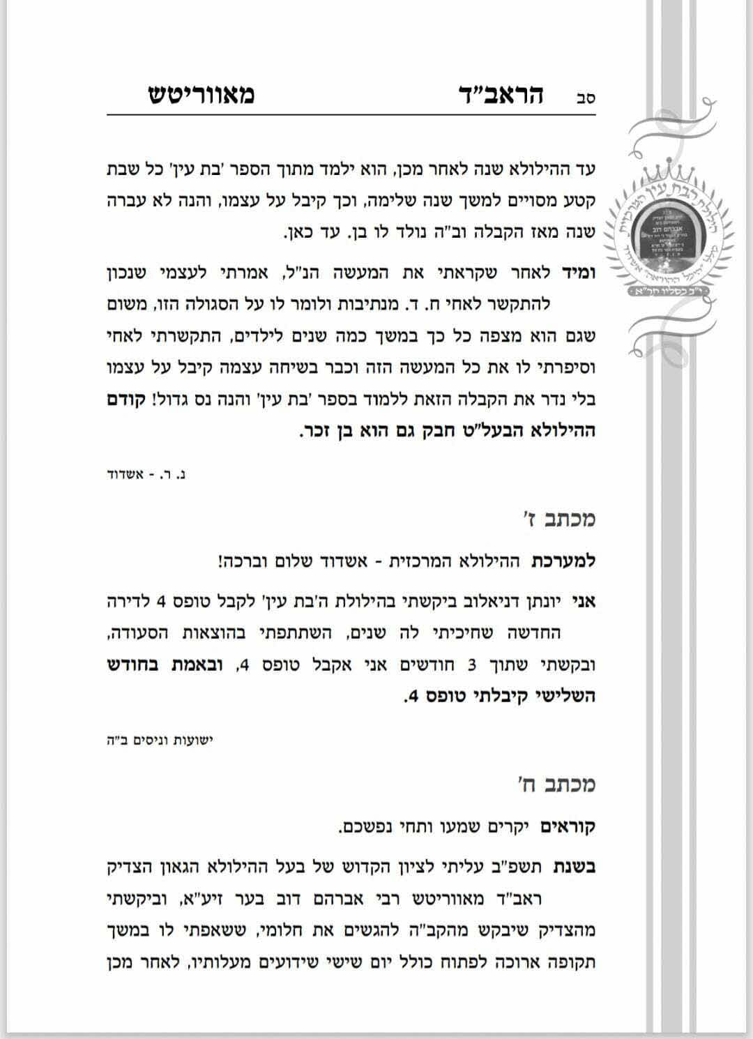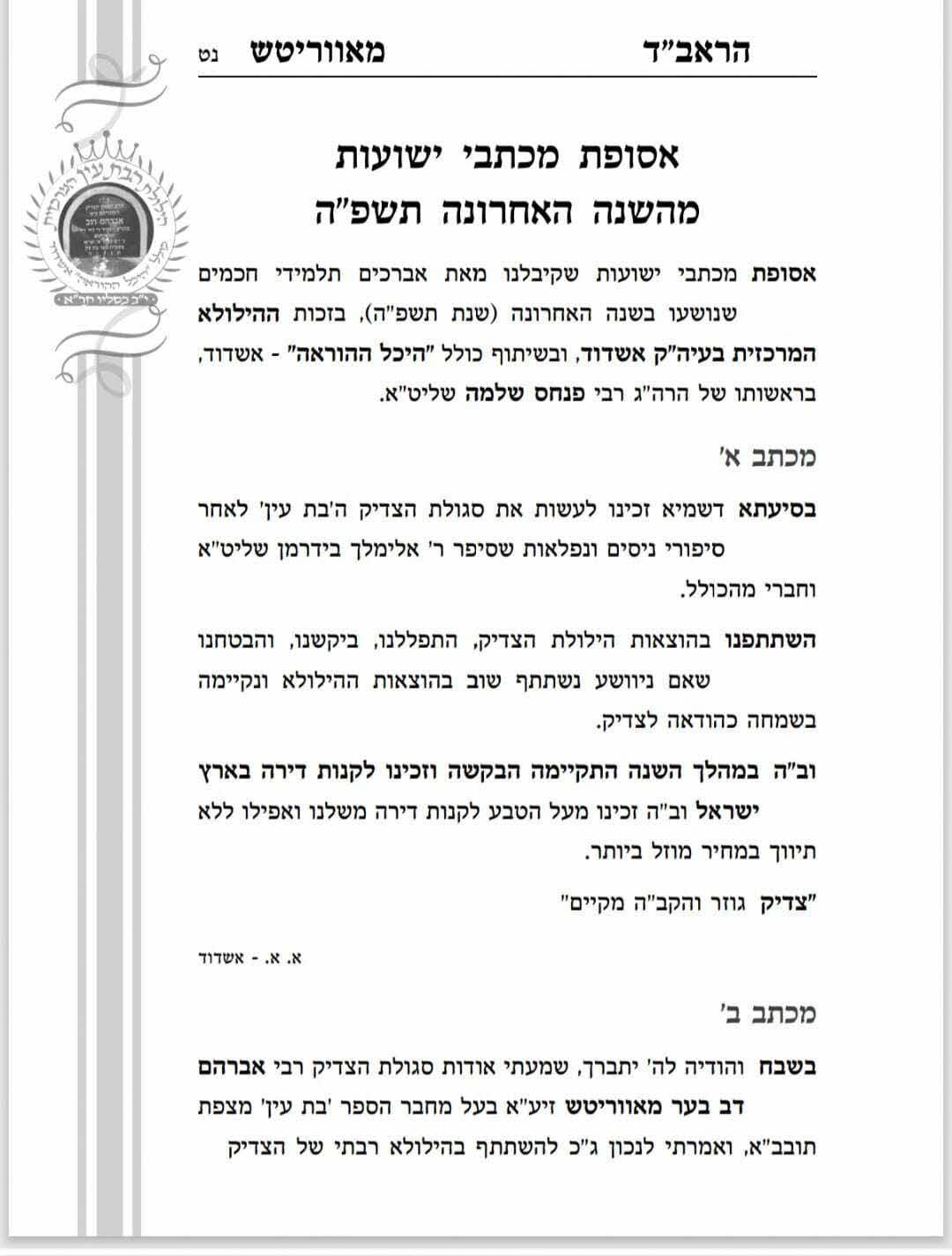מכתב ה' - שלום וברכה, ברצוני לספר את סיפורי המרגש, כמה שבועות קודם י"ב כסלו תשפ"ה החלטתי להיות שותף בסעודה ההילולא המרכזית באשדוד בראשות האברך הרב נתנאל רביבו שליט"א, וזאת משום שכ-14 שנים אנו מצפים לילדים, הפכנו כל אבן, התפללנו בכל מקום, והנה עוד לא הגי התאריך י"ב כסלו תשפ"ו וב"ה נולדה לנו בת בריאה ושלמה, וכמובן שכל תפילה ותפילה עזרה, אבל הגמר היה בידו של הצדיק בעל ההילולא זכותו תגן עלינו אמן.