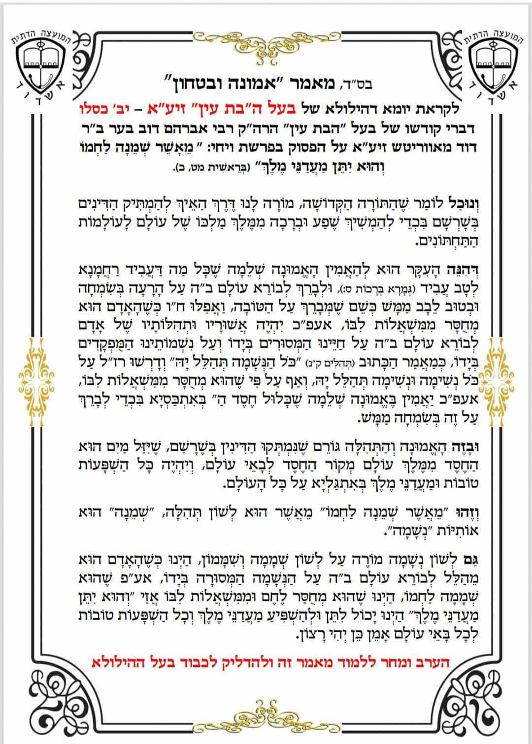 המועצה הדתית הוציאה לקראת ההילולא דף מאמר "אמונה ובטחון" מדברי קודשו של בעל ההילולא בביאורו הנודע על הפסוק: מאשר שמנה לחמו והוא יתן מעדני מלך". שע"י ההודאה לה' ית' על הנשמה המסורה בידו יוכל לזכות להשפעות גדולות.