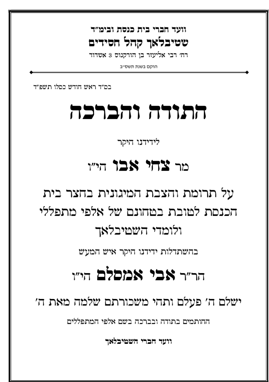 'שטיבלאך' ממוגנים: המתפללים הרבים הפוקדים בכל יום, וגם בשעות הלילה, את שטיבלאך 'קהל חסידים' ברובע ז', יזכו מעתה לפתרון מיגון לאחר שהערב (א') הובאה מיגונית שהונחה בצמוד לשטיבלאך.