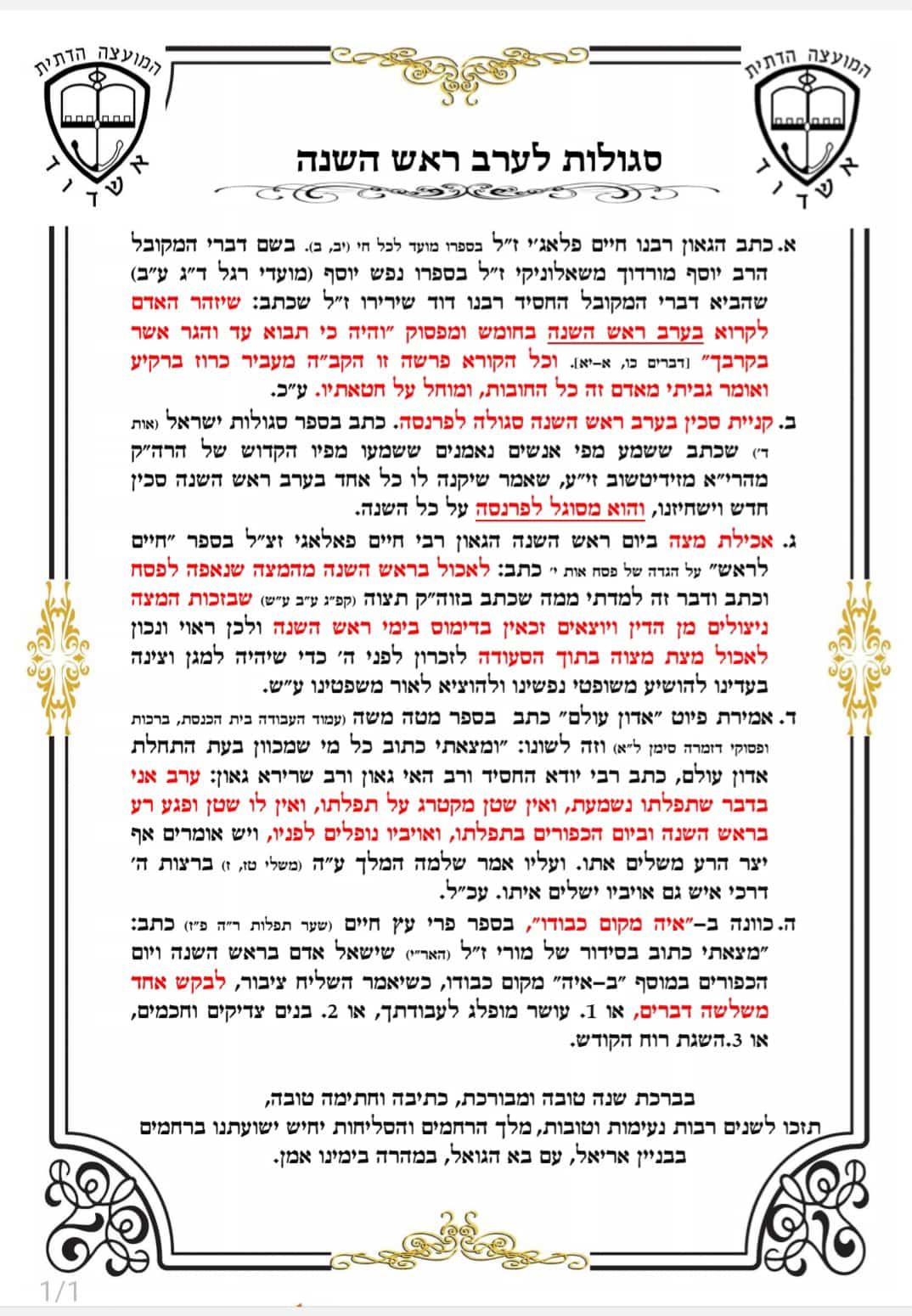 על כן במועצה הדתית חשבו על רעיון של הכנת 'דף תזכורות' אשר יש לעבור עליו היום ומחר, על מנת שנהיה מוכנים לימים הבאים – 2 ימי ראש השנה ושבת קודש.