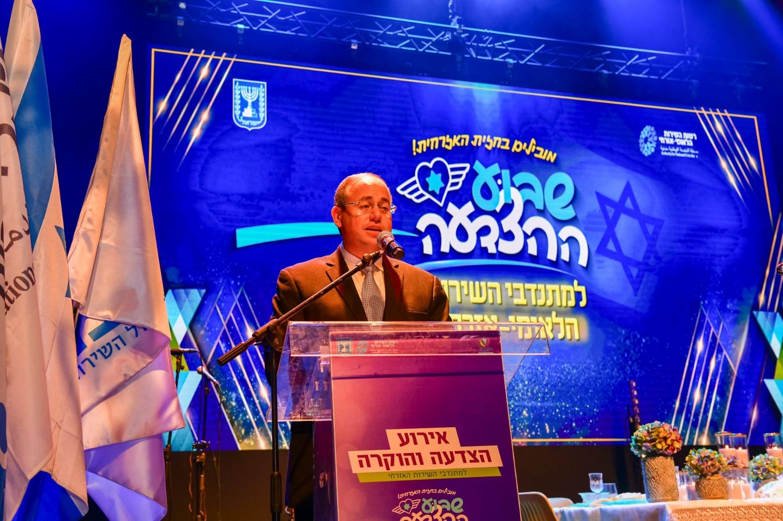לאחר מכן החל המעמד המרכזי באודיטוריום כאשר מנכ"ל הרשות מר ראובן פינסקי נושא דברי פתיחה. בדבריו הדגיש את העשייה המרשימה לטובת בני השירות לאורך כל הדרך.