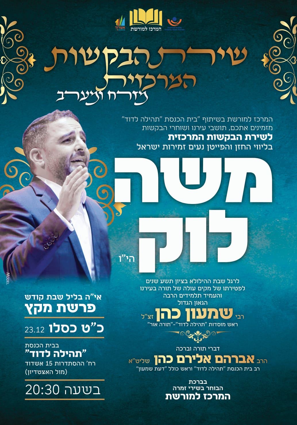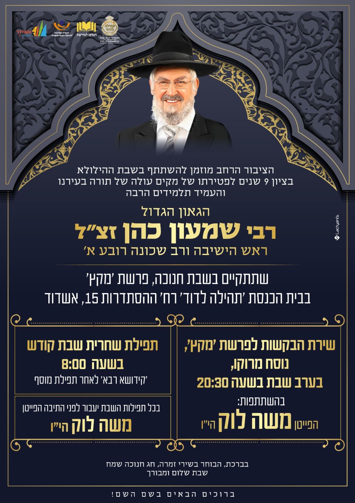 המרכז למורשת בראשותו של מ"מ ראש עיריית אשדוד אבי אמסלם הזמין לשבת חנוכה את תושבי רובע א' וכלל תושבי העיר לשבת מלאה שירה ופיוט עם הפייטן משה לוק בבקשות המרכזיות וציון האזכרה לגר"ש שמעון כהן זצוק"ל.