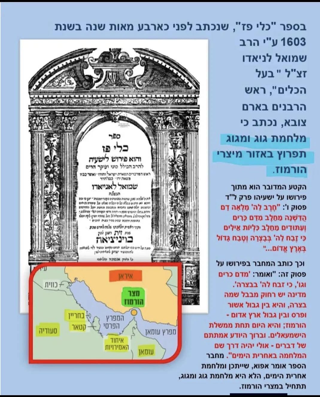 בספר "כלי פז", שנכתב לפני כארבע מאות שנה בשנת 1603 ע"י הרב שמואל לניאדו זצ"ל "בעל הכלים", ראש הרבנים בארם צובא, נכתב כי מלחמת גוג ומגוג תפרוץ באזור מיצרי הורמוז.