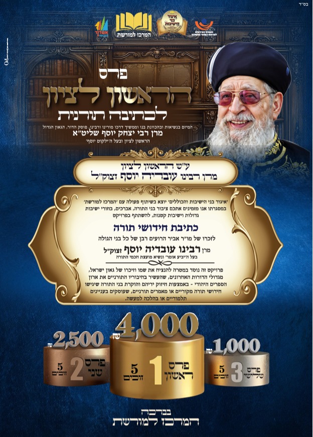 אחרי הכנס האדיר שהתקיים בסימן סיום בין הזמנים וראש חודש אלול, ב'מרכז למורשת' בראשות מ"מ ראש העיר הרב אבי אמסלם לא מבזבבזים זמן וכבר משיקים מחזור חדש של מיזם "פרס הראשון לציון לכתיבה תורנית" בשיתוף "איגוד בני הישיבות והכוללים" בראשות חבר מועצת העיר הרב אהרון כהן.